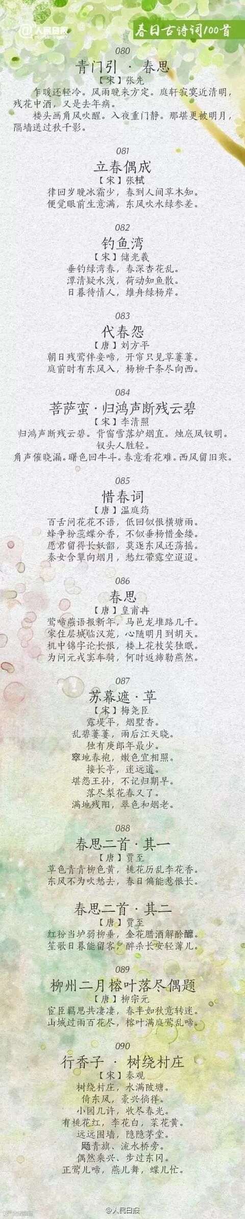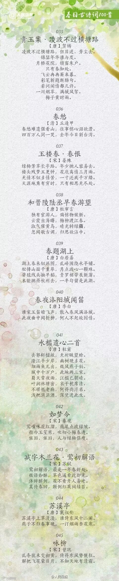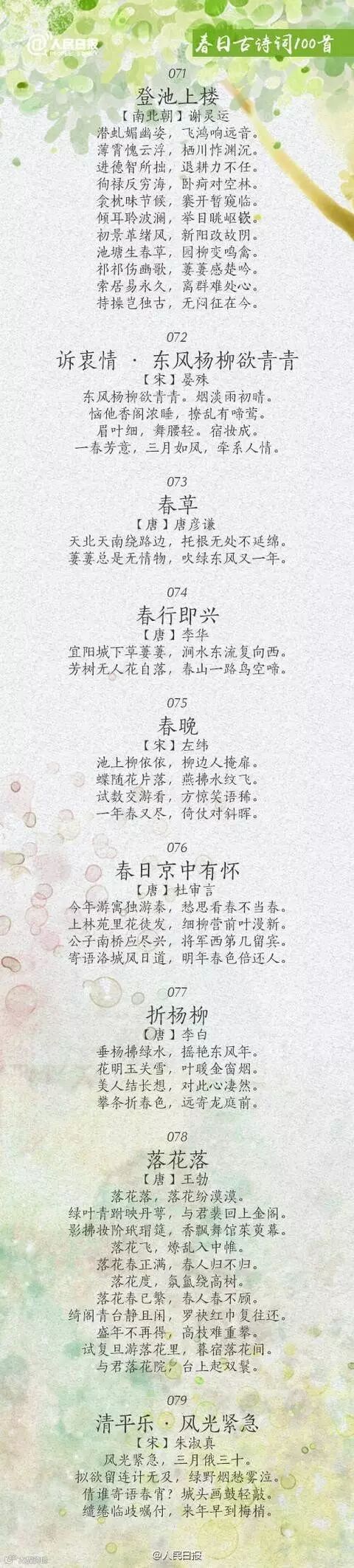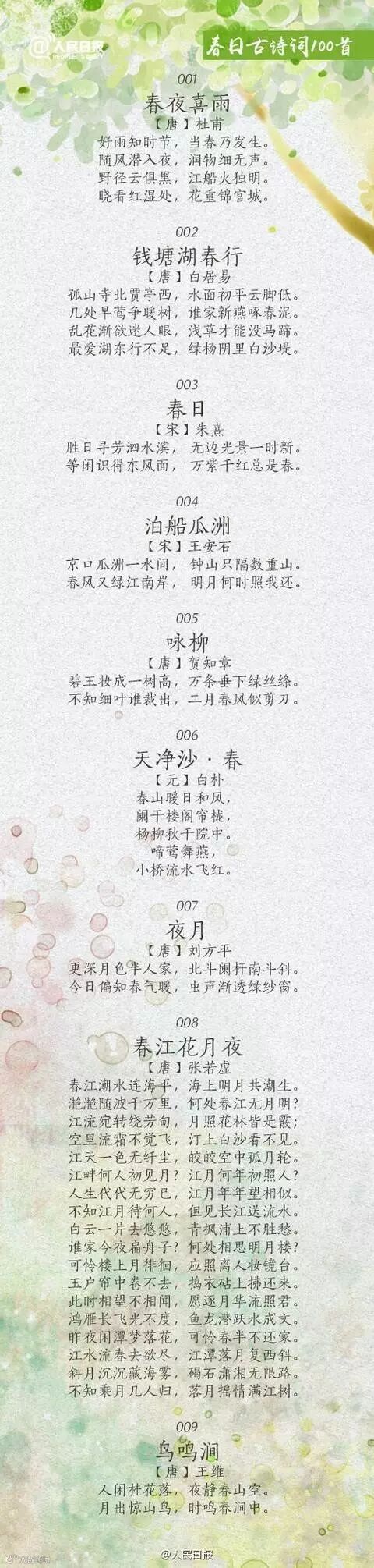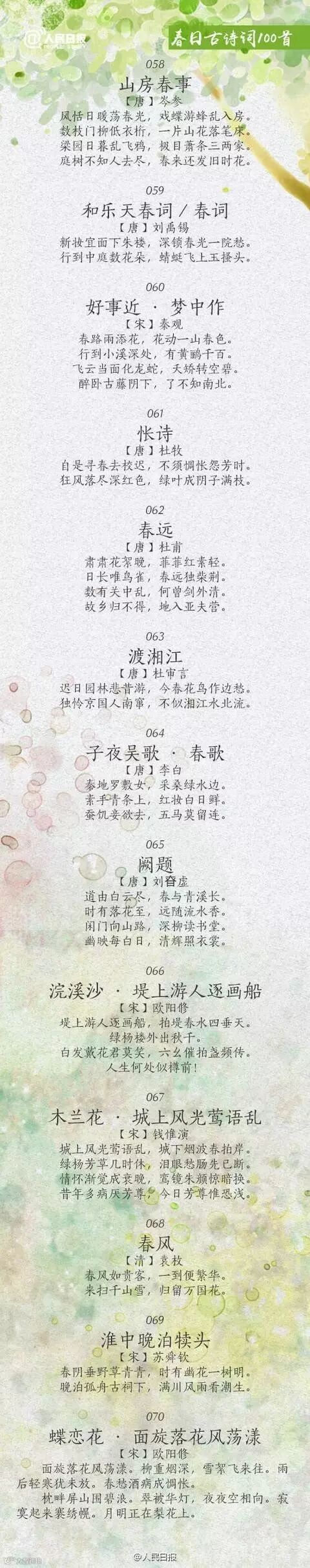 最是一年春好处,今天就与各位家长朋友们分享100首关于春的诗歌,作为学生时代必背的诗词,不仅值得收藏了给孩子当做写作、积累的资料,自己还能品味古诗词里春的韵味,你们都还能否背出来,都还记得几首?