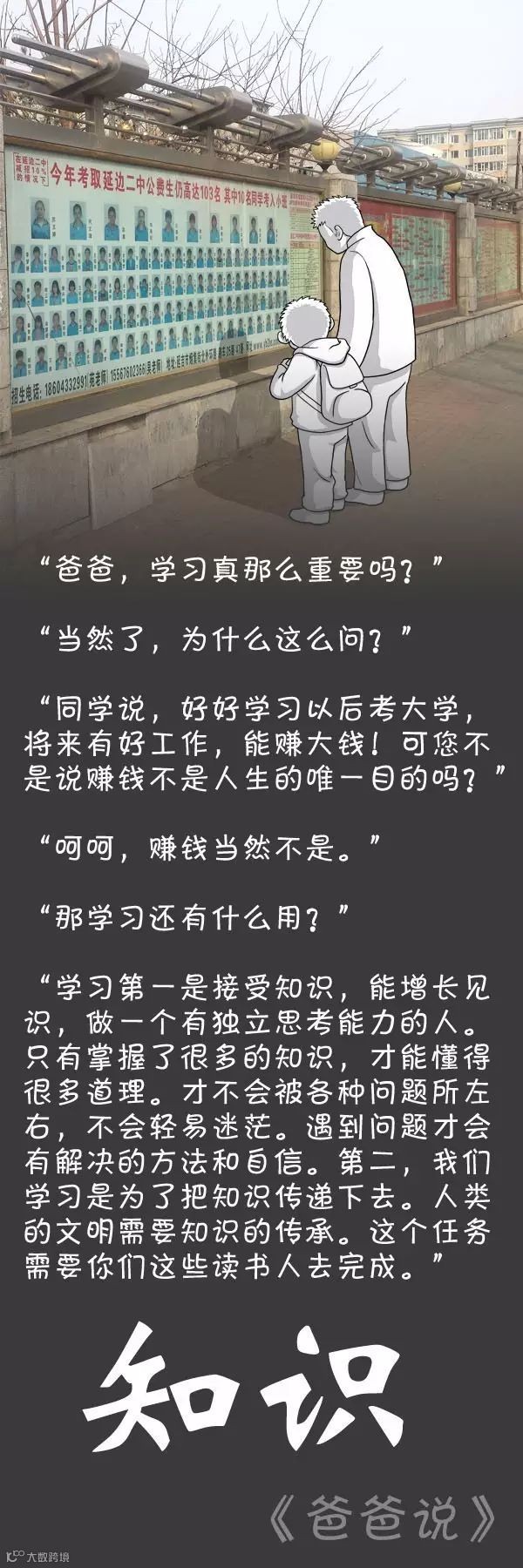 近日,一组父子对话的漫画火爆网络。或许你曾经在朋友圈看过,这次如果有缘再读,或许你该仔细斟酌消化。为什么很多人闯红灯?孩子给家里做家务父母要给钱吗?越有钱就越了不起?学习真那么重要吗?什么叫有礼貌?什么是内在美?怎么做才叫爱国?