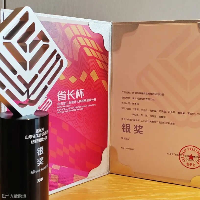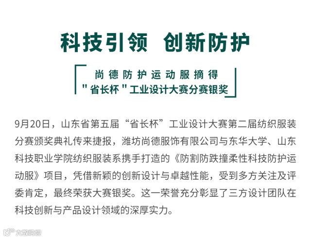 导读:山东省第五届“省长杯”工业设计大赛纺织服装分赛中,潍坊尚德服饰有限公司与东华大学、山东科技职业学院纺织服装系携手打造的《防割防跌撞柔性科技防护运动服》项目荣获大赛银奖。