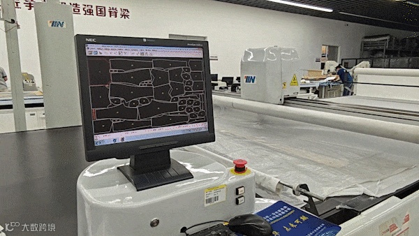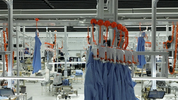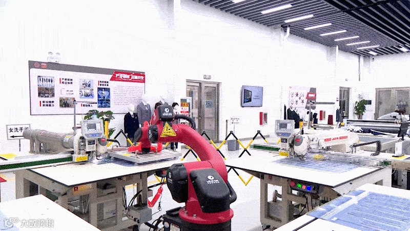 生产车间由MES系统与各生产设备相衔接,面料由数控裁床实现精准裁剪,缝制环节由各岗位熟练工人和机械臂+无人模板缝纫机协同完成,整个校服生产环节,通过服装吊挂系统和AGV无人转运车组成的立体输送网络,快速精准流转,实现“不落地生产”。