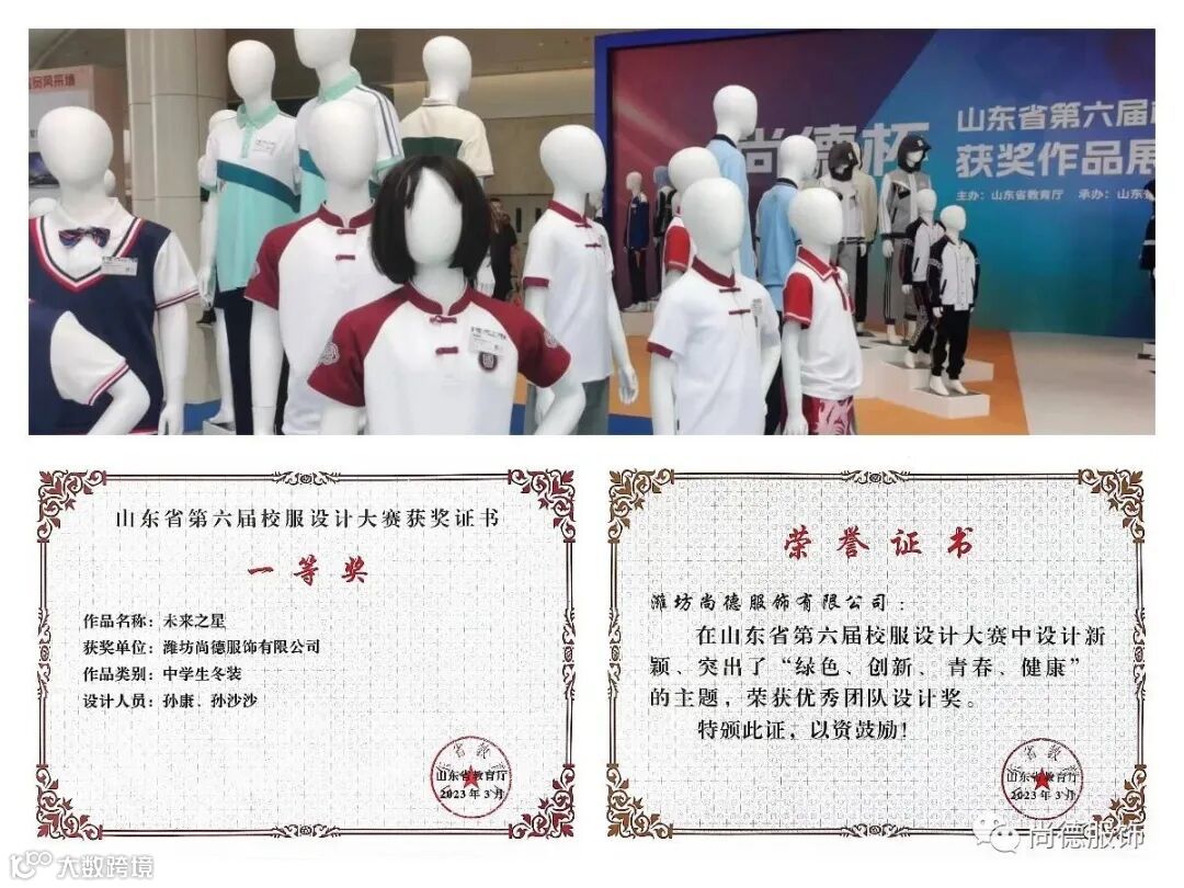 随着研发、制造等过程的不断投入,公司创新产品持续迭出,获奖作品不断涌现。在此次展会开幕式现场的一侧,同步举行的“山东省第六届校服设计大赛”获奖作品展示中,尚德服饰以一等奖一个,二等奖两个,三等奖三个及优秀团队奖一个,成为现场瞩目的明星企业。