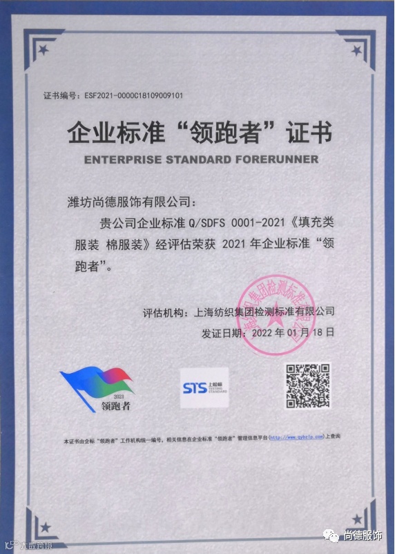 另外,公司还参与修订国家标准、行业标准各1项,牵头制订团体标准1项,参与制订团体标准5项。企业标准Q/SDFS 0001-2001《填充类服装 棉服装》曾荣获2021年企业标准“领跑者”等多项荣誉,实现行业领先。