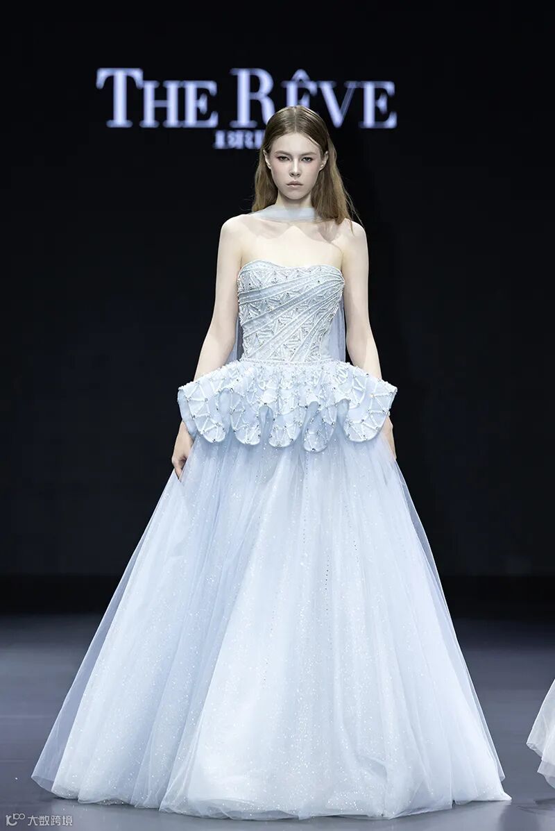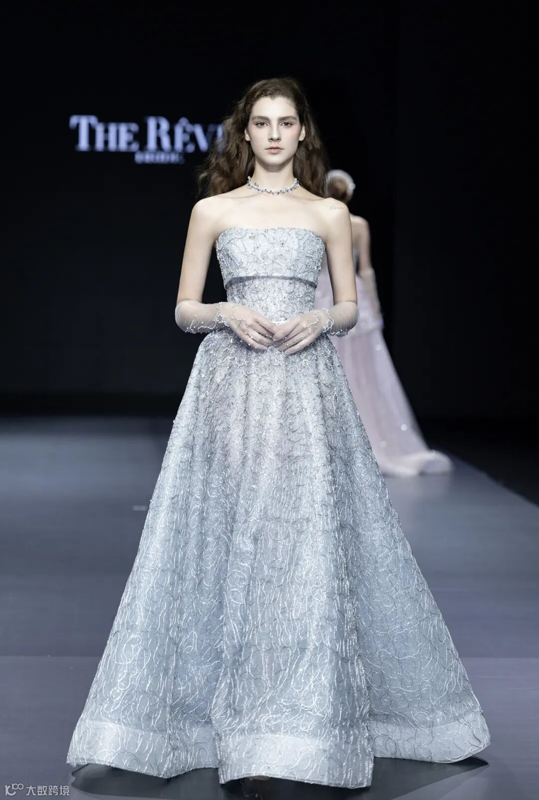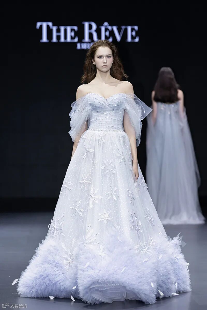设计融合自然元素、建筑几何美感与光影韵律,以流畅线条勾勒花、叶、蝶,再借刺绣勾勒纹理、浮雕塑造图案,让自然元素顺着线条“生长”,宛如沿着光的轨迹筑就梦想之境。新娘身着此婚纱,似与溯光筑梦意境交融,成为 The Rêve 画卷中最令人心醉的风景。