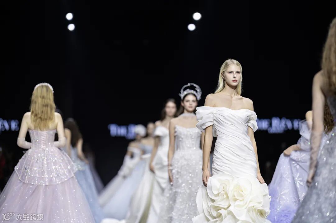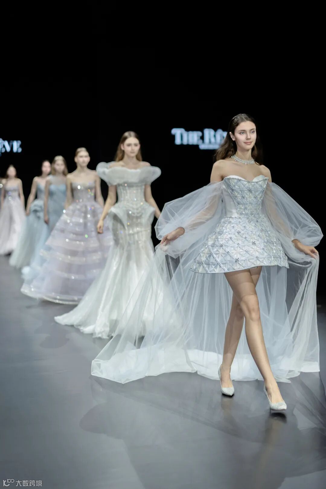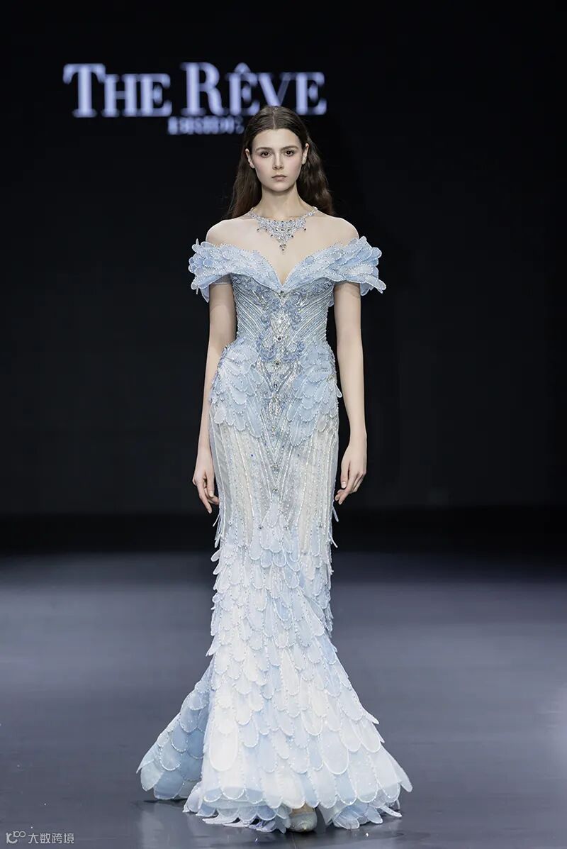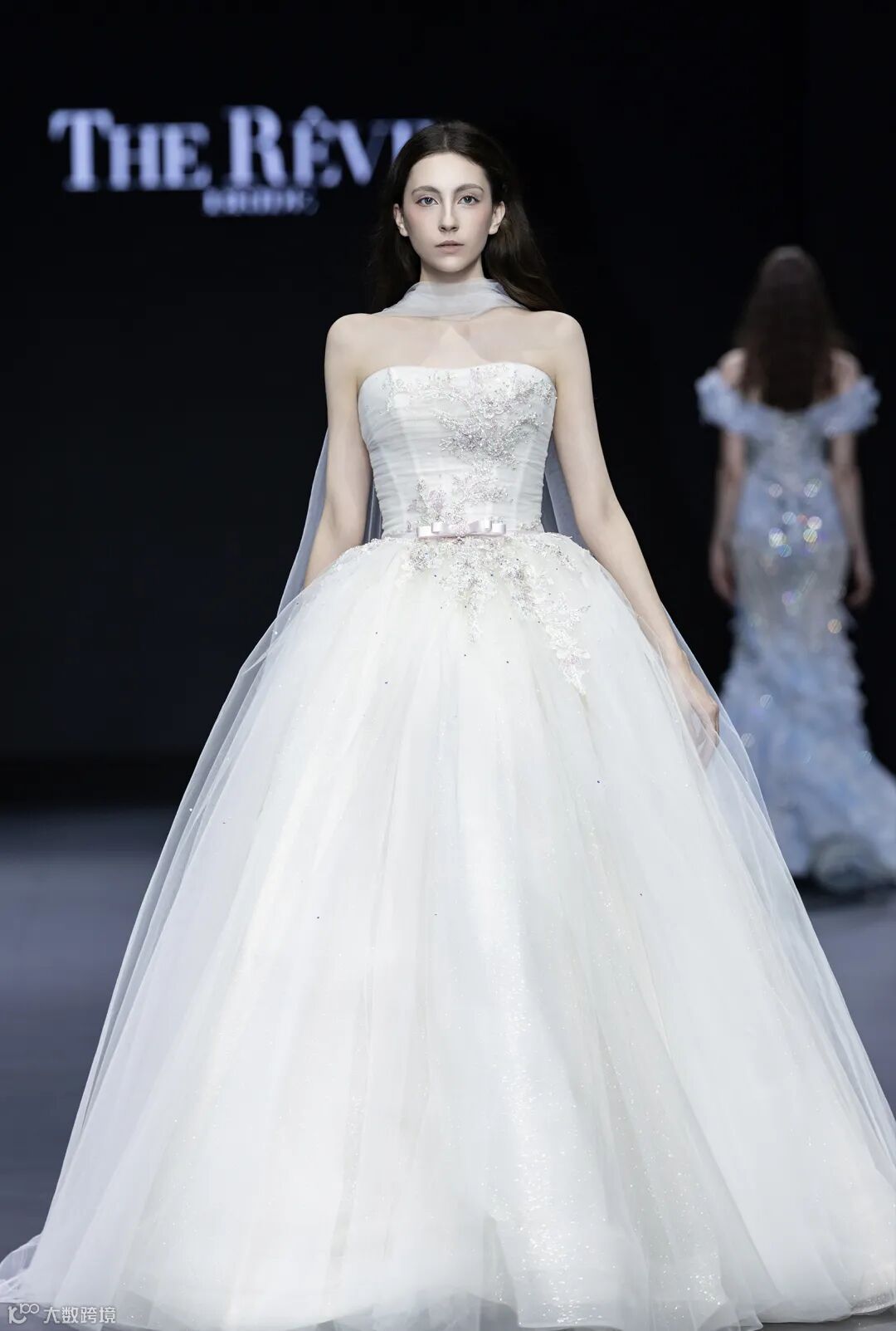 设计融合自然元素、建筑几何美感与光影韵律,以流畅线条勾勒花、叶、蝶,再借刺绣勾勒纹理、浮雕塑造图案,让自然元素顺着线条“生长”,宛如沿着光的轨迹筑就梦想之境。新娘身着此婚纱,似与溯光筑梦意境交融,成为 The Rêve 画卷中最令人心醉的风景。