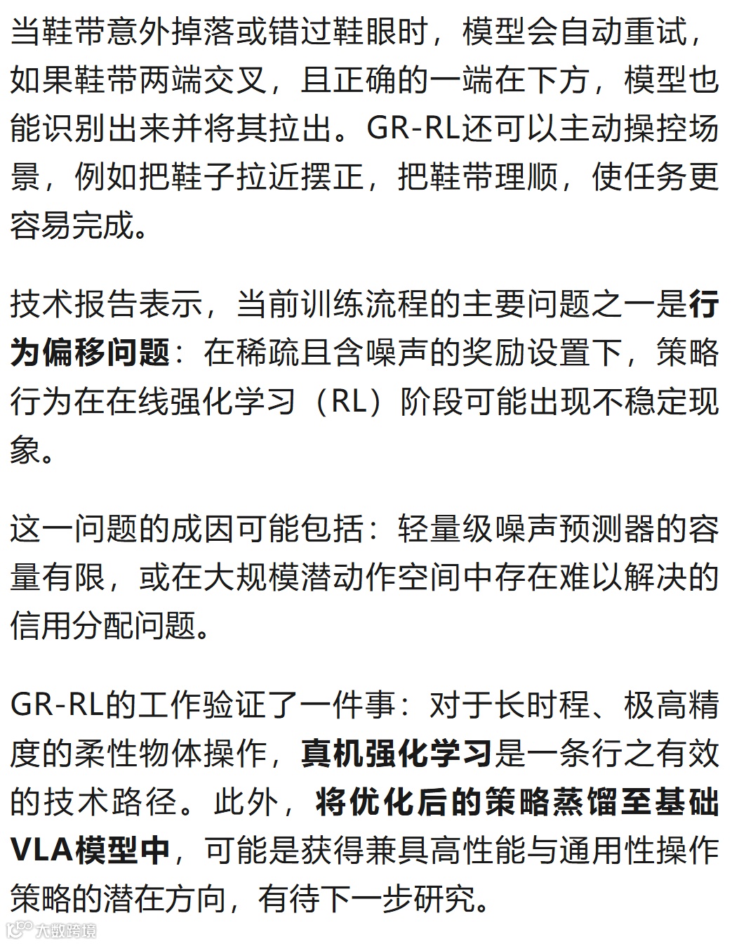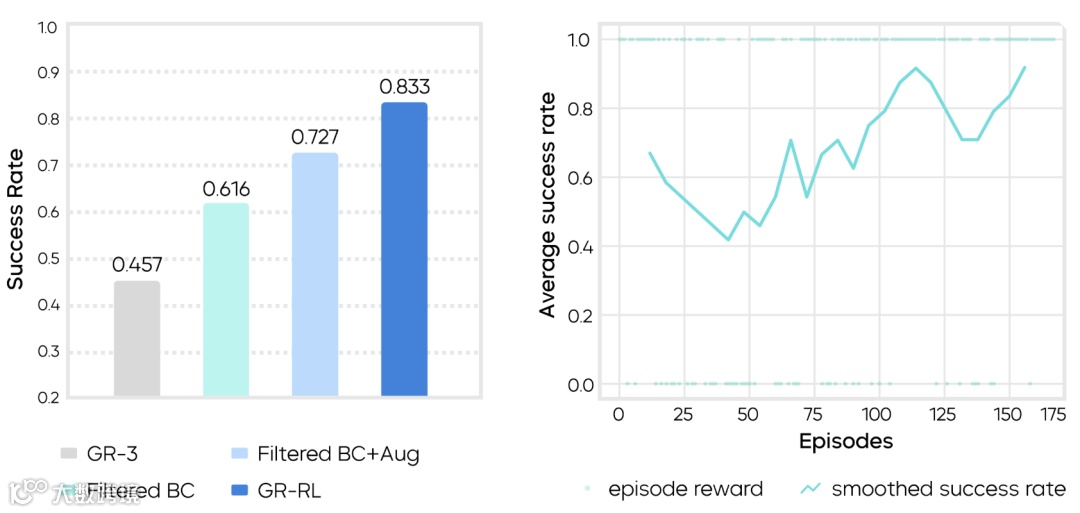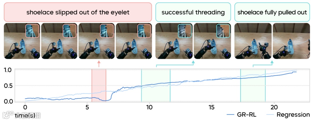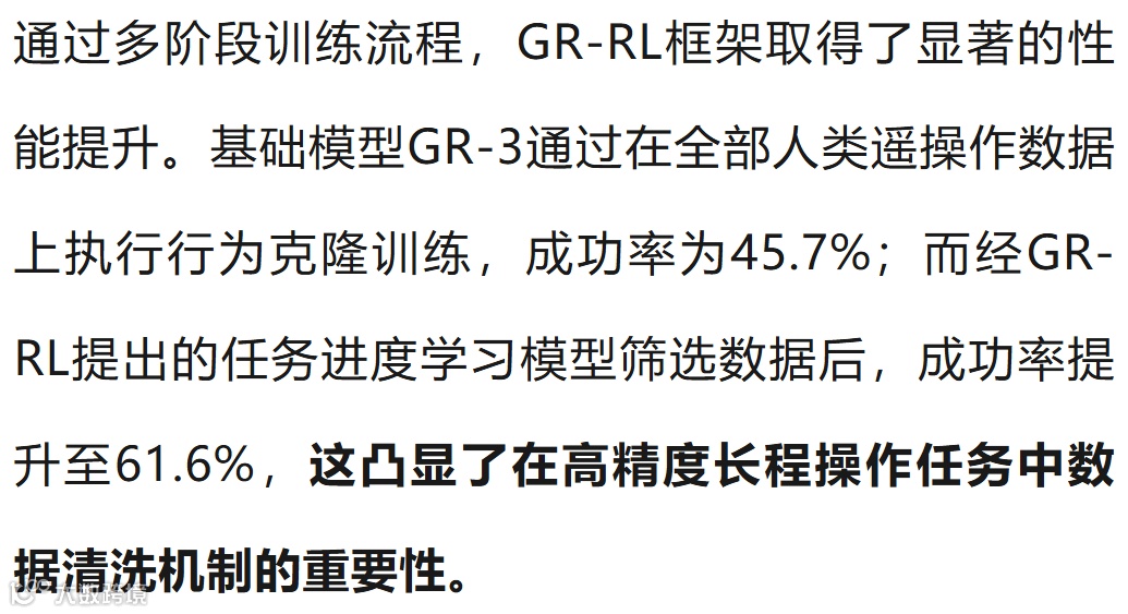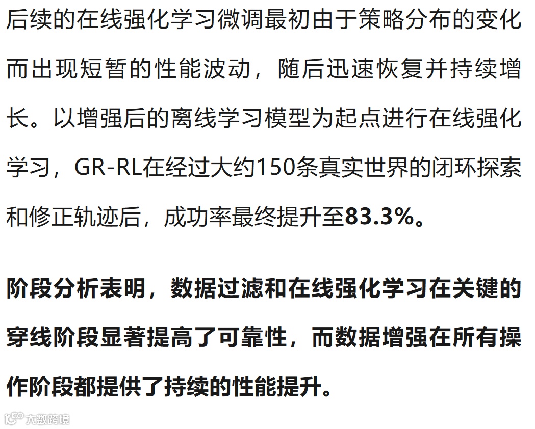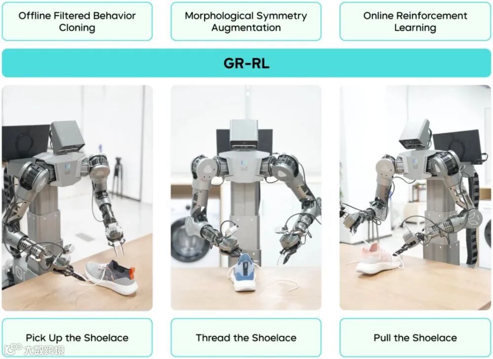 GR-RL模型提出了一个从离线数据筛选到在线真机微调的强化学习框架,首次实现“让机器人给整只鞋连续穿鞋带”,成功率达83.33%——该任务需具备长程推理能力、毫米级操作精度及柔性软体交互能力,这有望为通用机器人基础模型向可靠的现实世界专家模型转化提供强力技术支撑。