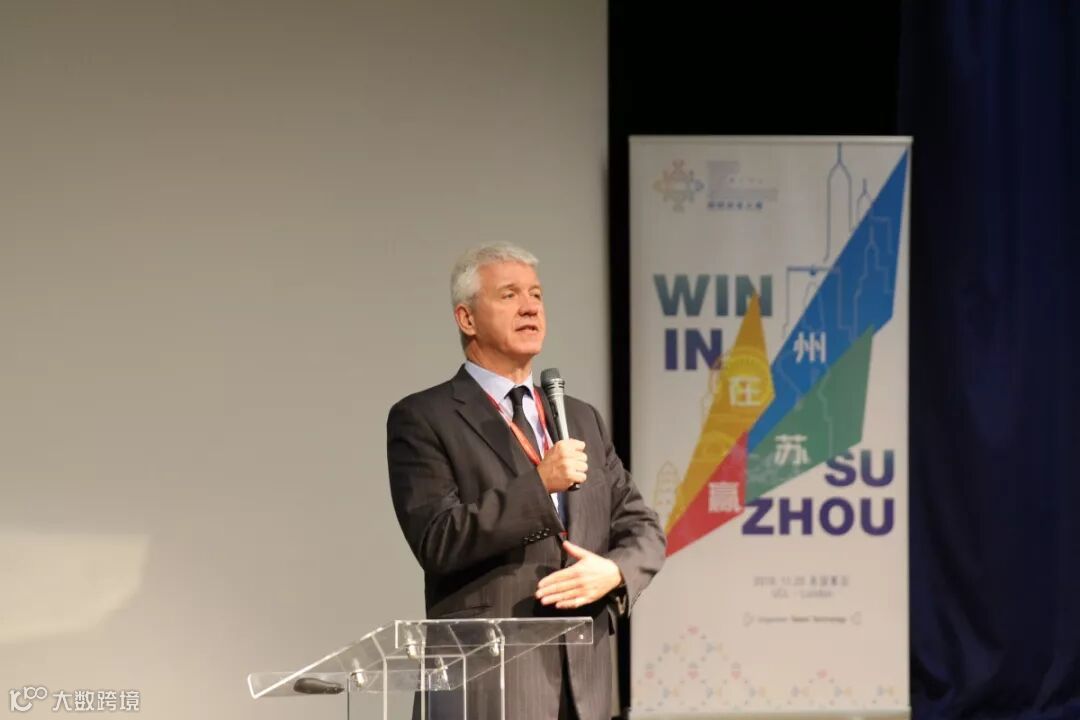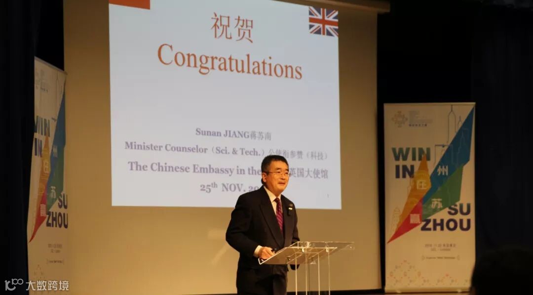 首先,主持人向参会的全体高层次人才播放了苏州城市的推广影片和本次大赛的宣传片。随后,蒋苏南公参代表中国驻英国大使馆进行了活动致辞,并对本次活动成功举办表示了热烈的祝贺。蒋公参在讲话中介绍了中英科技创新合作基本情况,中国科技发展的最新成就和中英创新合作的新机遇,表达了使馆对于海外学子归国创新创业的支持和鼓励,并热情的推荐和欢迎大家去苏州发展自己的事业。