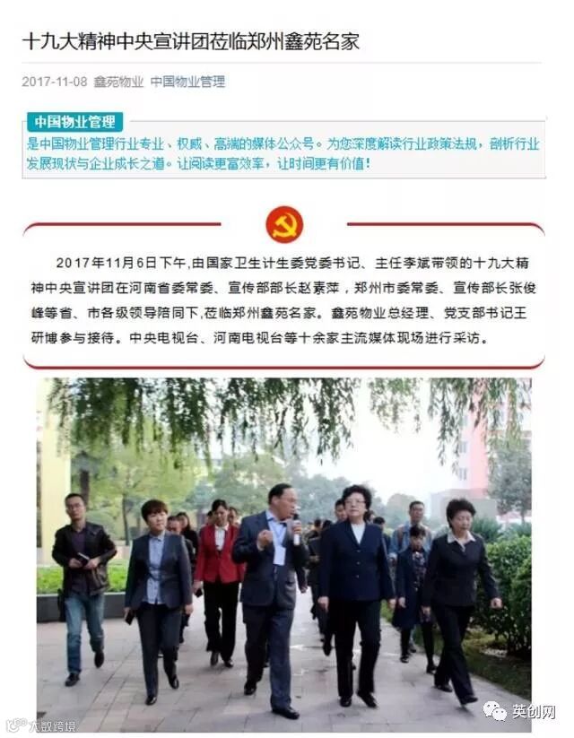 包括中国物业管理协会、中国物业管理杂志、河南省物业管理协会、郑州市物业管理协会在内的四家物业行业的官方微信都对“”十九大精神中央宣讲团莅临郑州鑫苑名家”的新闻进行了全面报道。展现了鑫苑物业优秀品质的深入人心和品牌强大的号召力。
