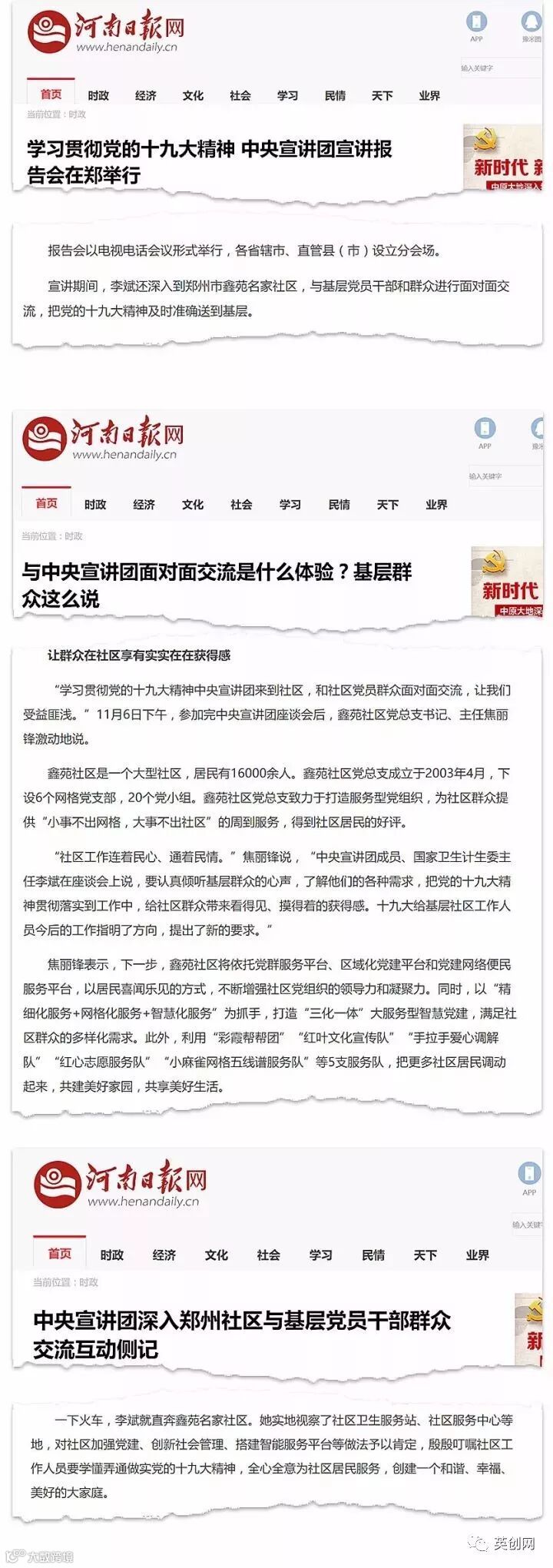 河南日报接连发布了三篇报道,详细介绍了十九大精神中央宣讲团来到鑫苑名家社区的情况。
