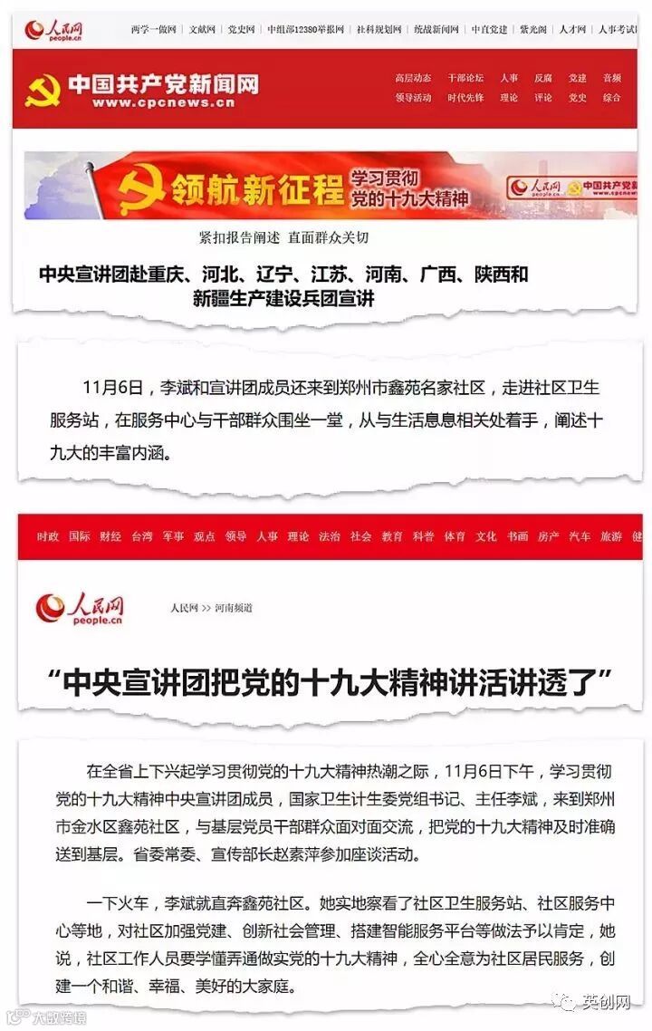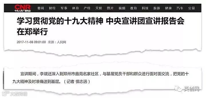 新华网在报道中提到,“6日下午,李斌一行走进郑州市金水区北林路街道办事处鑫苑社区,与基层干部群众交流。现场提问踊跃,交流精彩纷呈。‘听了宣讲才明白,十九大报告原来离咱老百姓的生活这么近!’鑫苑社区居民邵静说。”