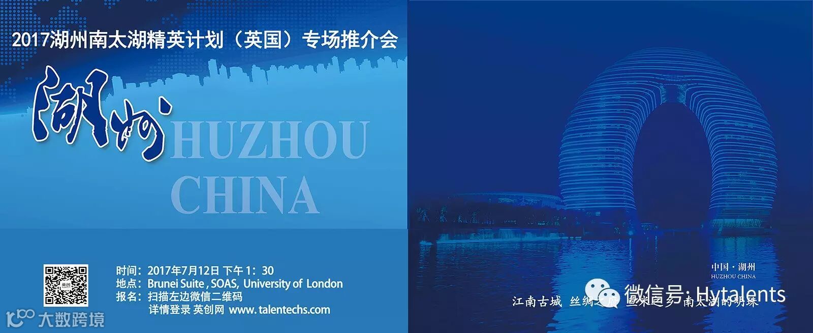 由湖州市人民政府主办,中英科技文化协会承办的 “2017中国·湖州(伦敦)南太湖精英计划专场推介会”,将于2017年7月12日下午1:30在伦敦大学亚非学院Brunei Suite举行。