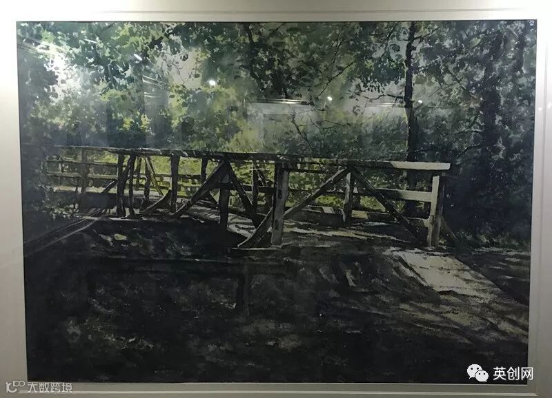 《阳光下的木桥》是用木笔水彩画法创作的代表作品。该景色来源于封思孝伦敦住所附近的一座木桥。他用柳木削成的木片画出方块或者菱形结构的笔触。(图片来源:欧洲时报实习记者丁艺 摄)