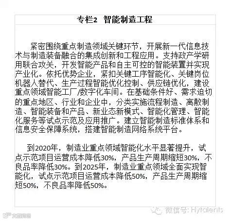 到2025年,制造业整体素质大幅提升,创新能力显著增强,全员劳动生产率明显提高,两化(工业化和信息化)融合迈上新台阶。重点行业单位工业增加值能耗、物耗及污染物排放达到世界先进水平。形成一批具有较强国际竞争力的跨国公司和产业集群,在全球产业分工和价值链中的地位明显提升。