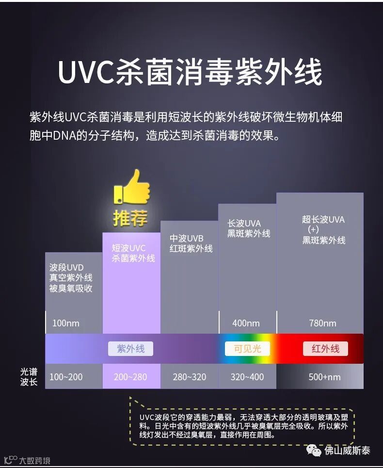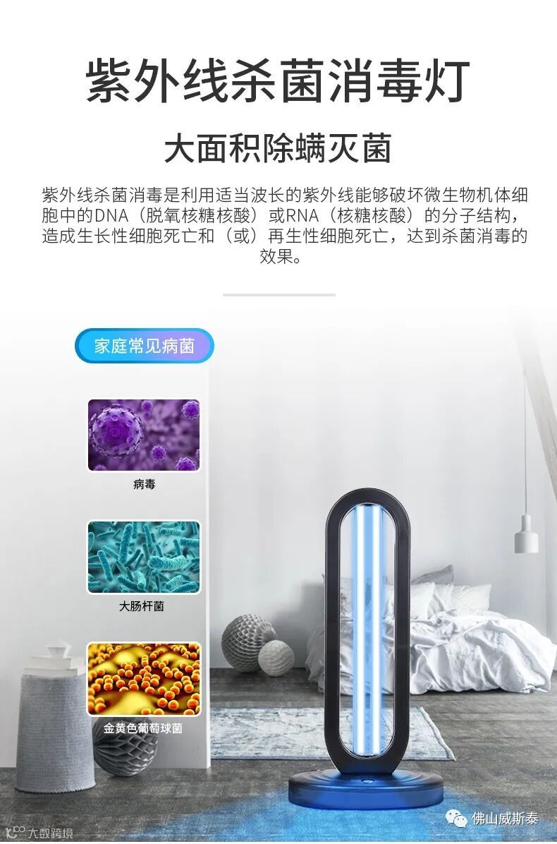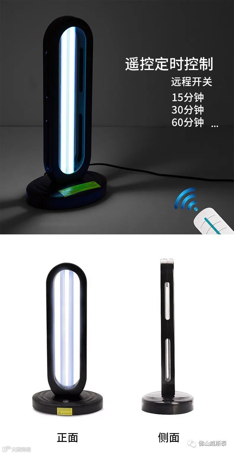 佛山威斯泰医用级别紫外灯 带定时和遥控 波长253nm 杀菌消毒,工作30分钟杀菌率(包括各种细菌和病毒)高达百分之九十九,可以有效帮助口罩消毒 延长口罩使用寿命。