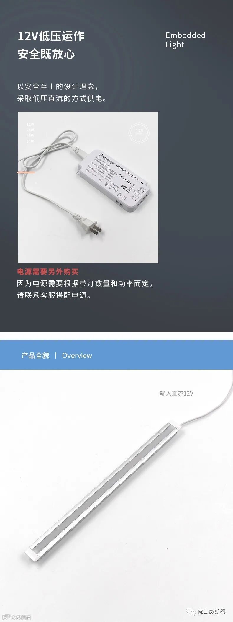 平堵头设计,美观大方,采用SMD LED芯片,节能省电,低压12V供电,安全低温