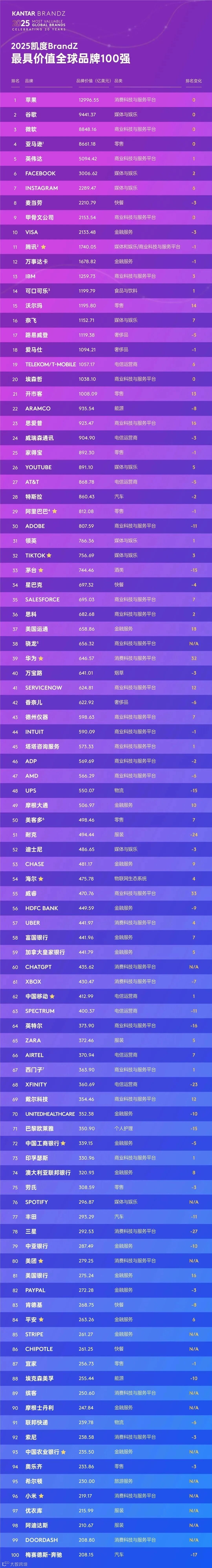 2025凯度BrandZ全球品牌100强榜单正式公布,华为创历史新高,位列全球第39位!