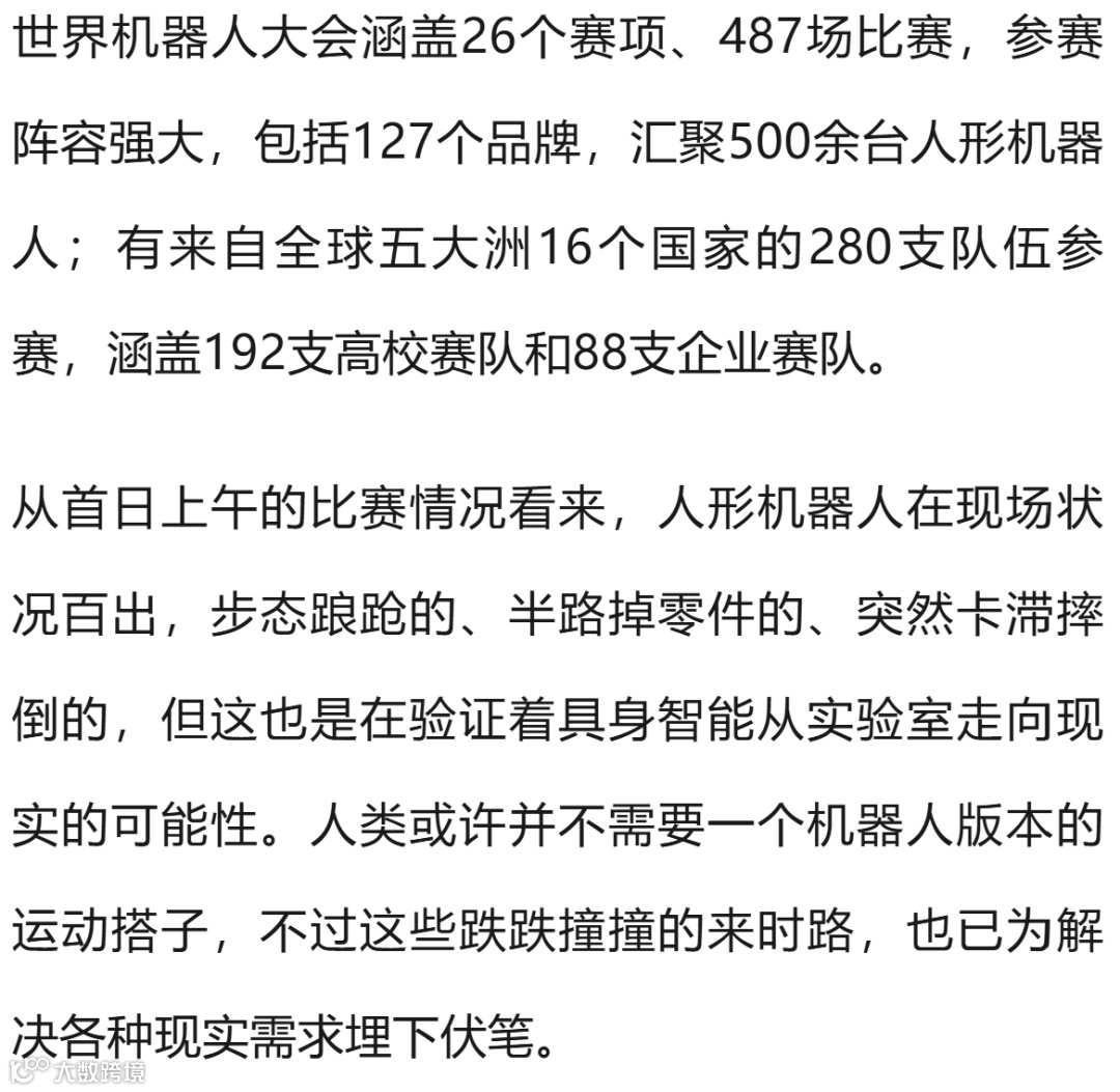 【52机器人8月15日消息】今天,世界人形机器人运动会首日赛程已经正式开启,上午进行了田径赛、足球赛、群体舞蹈、武术、自由搏击、篮球赛等多项比拼。