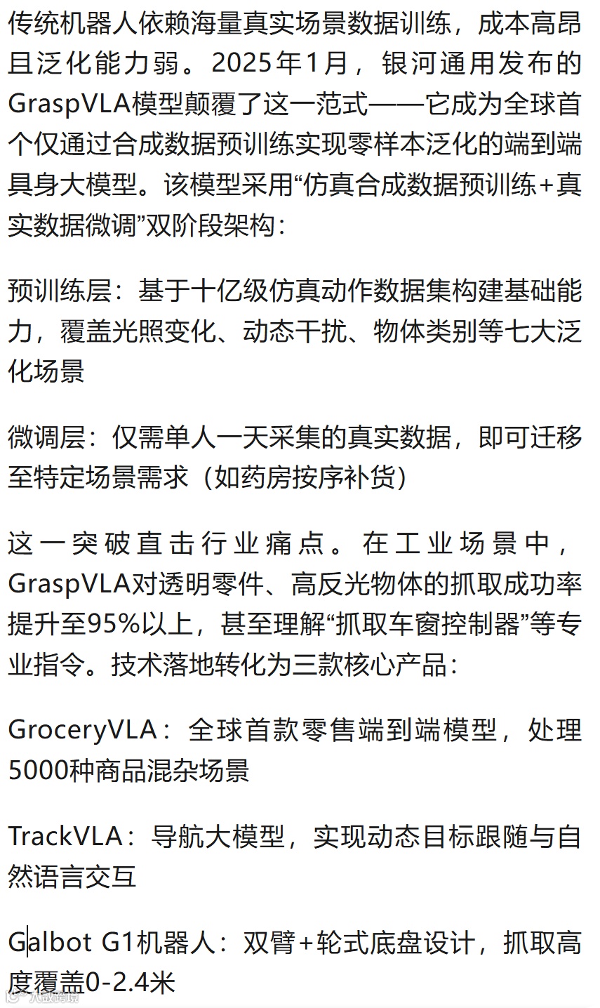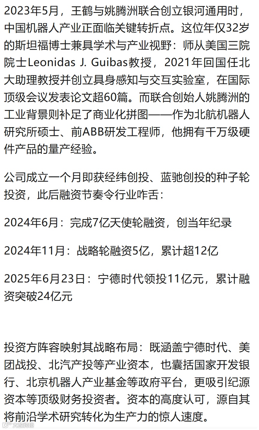 创始人兼CTO王鹤在最近一次2025智源大会上强调:“具身智能的当下核心目标,是坚定不移地实现产业化突破。”这揭示银河通用的终极野心——打造通用机器人产业平台。其技术路线已延伸至动态多模态融合算法,解决机械臂视觉-动作协同难题;与科大讯发旗下的讯飞创投合作的语音模块支持多语种混合指令识别,向全场景交互进化。