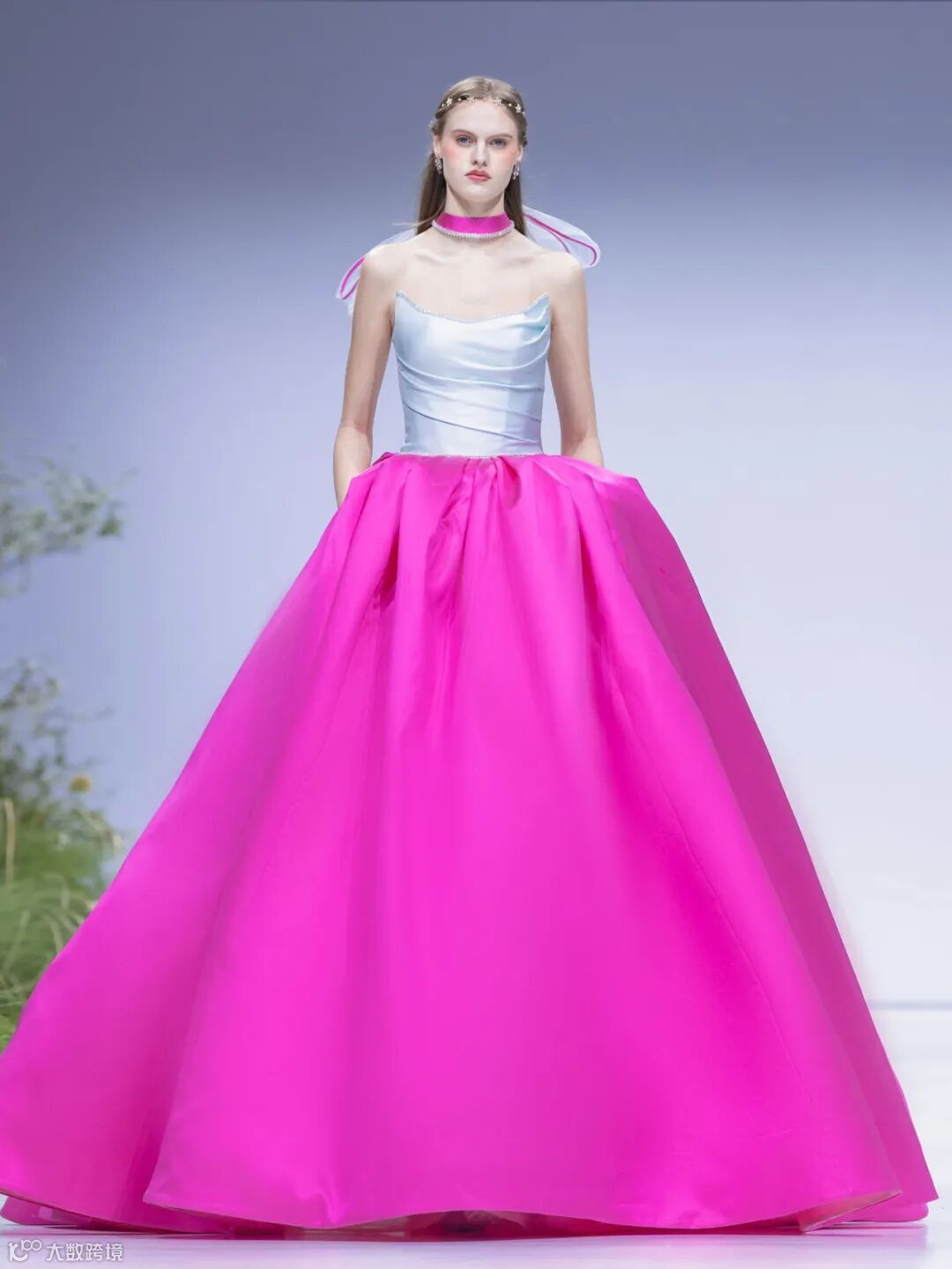 造梦时空系列呈现多样造型,以精致的工艺装饰与古典建筑结构相得益彰,更多的是体现浪漫。以立体褶裥图形、抽象的线条描绘对未来空间的畅想,将造梦时空中的奇幻意象用不同肌理、质地的面料进行解构、拼接,以色彩各异的金属股线在每一款设计上绘制时空中的溢彩。