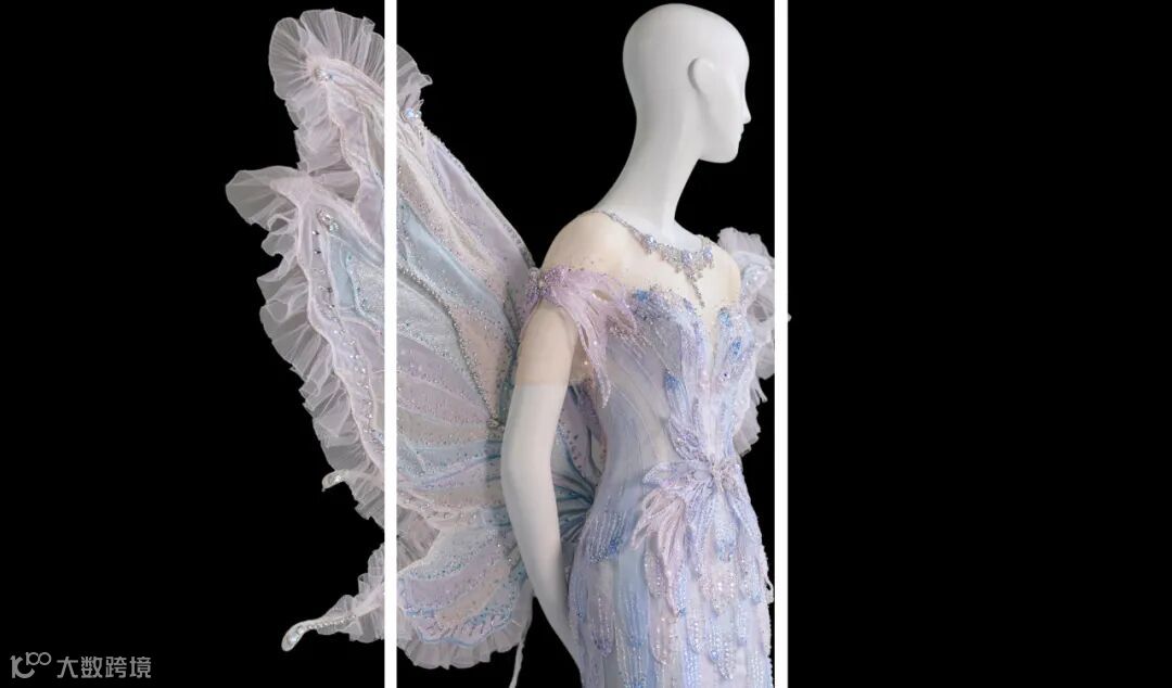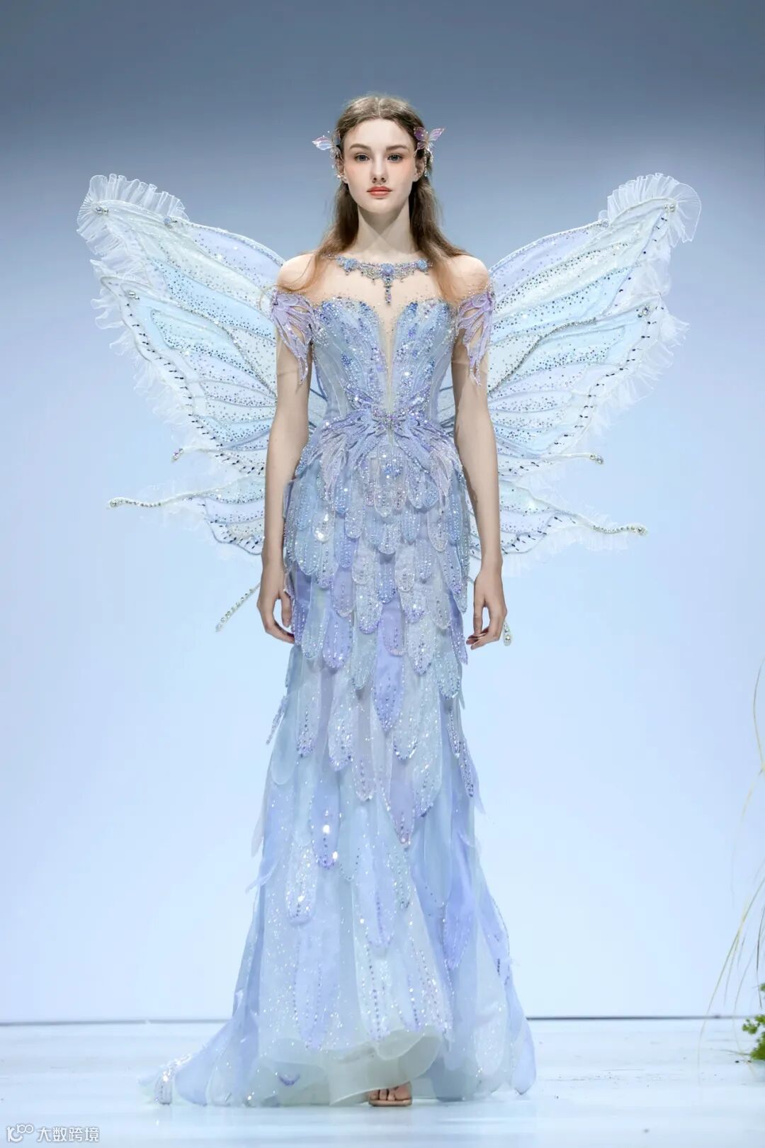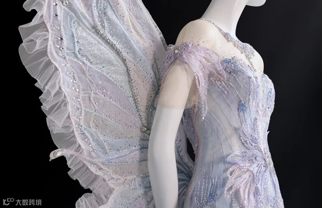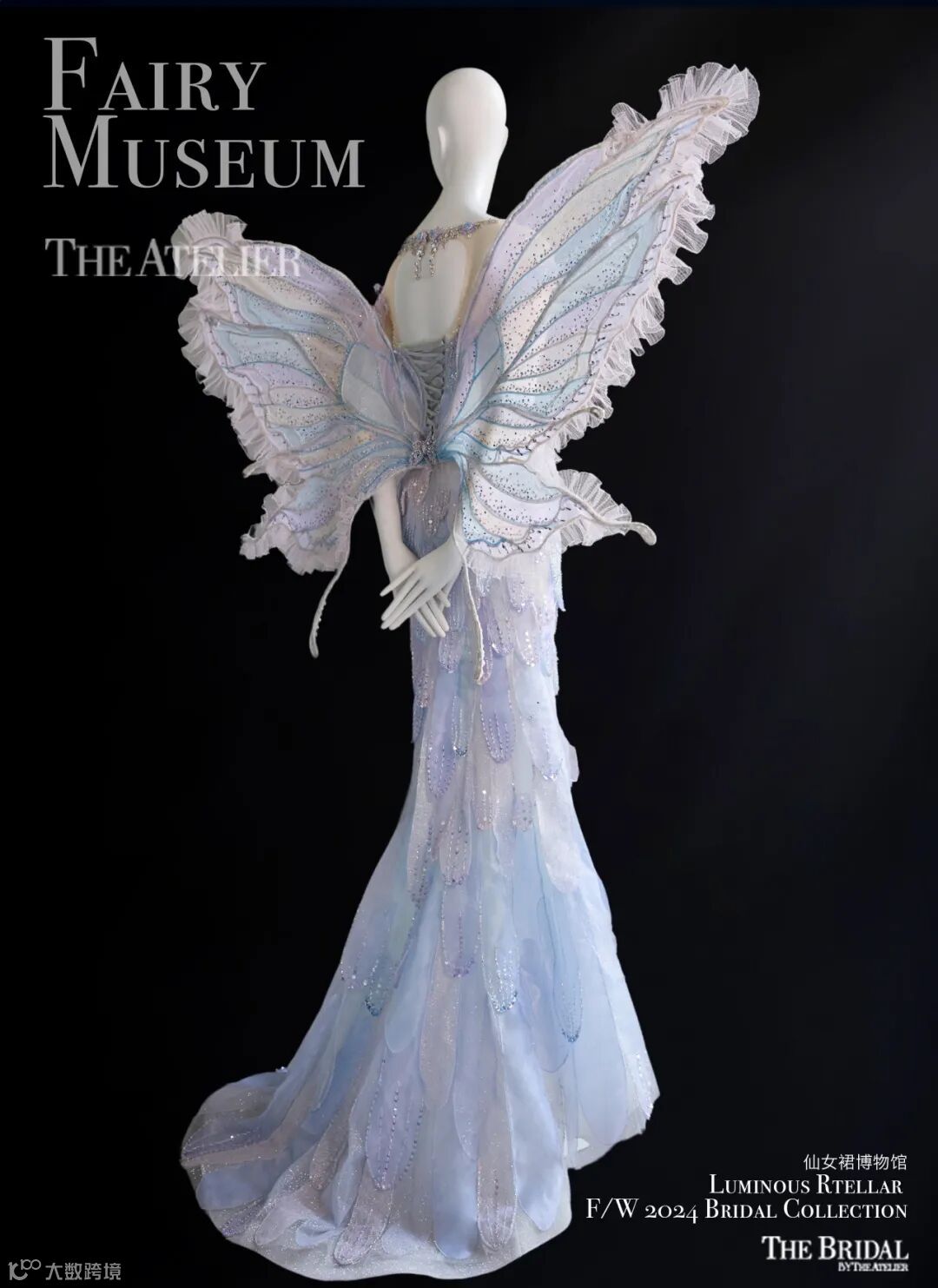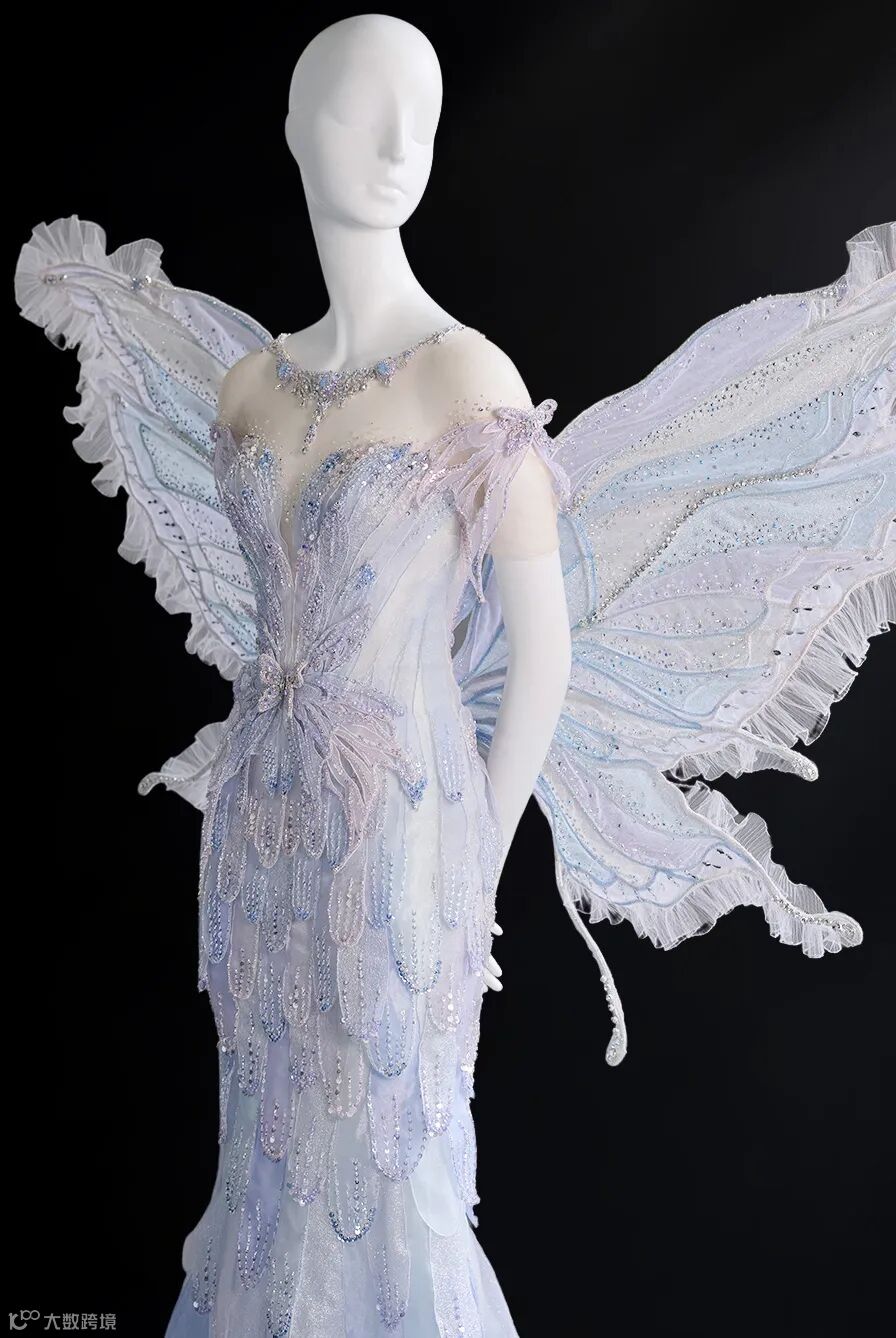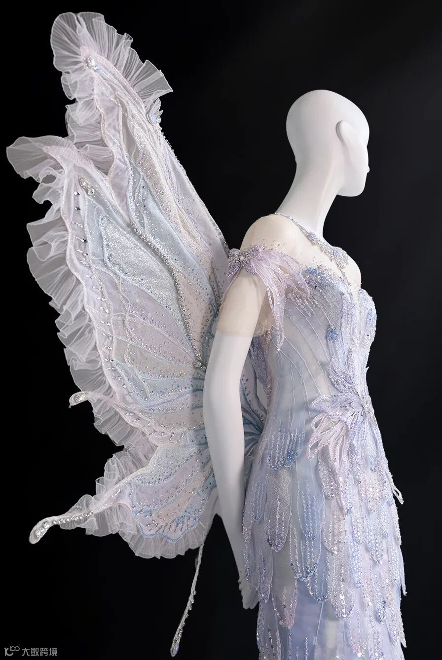 裙身,数片状的蝴蝶鳞片巧妙拼接,形成各种色彩斑纹。尤为引人注目的是,Nelly背后的蝴蝶翅膀,采用铜丝手工精心捏制而成,再点缀以缝钻与烫钻装饰工艺,使得Nelly更加璀璨夺目,仿佛置身春日的午后花园,梦幻羽翼汇于裙摆,氤氲着浪漫意境。