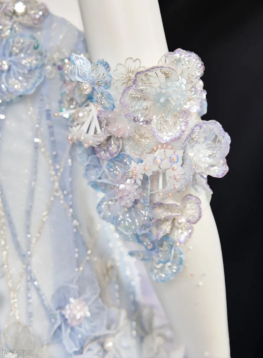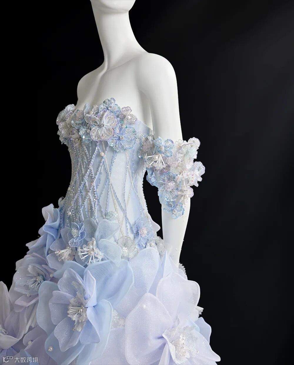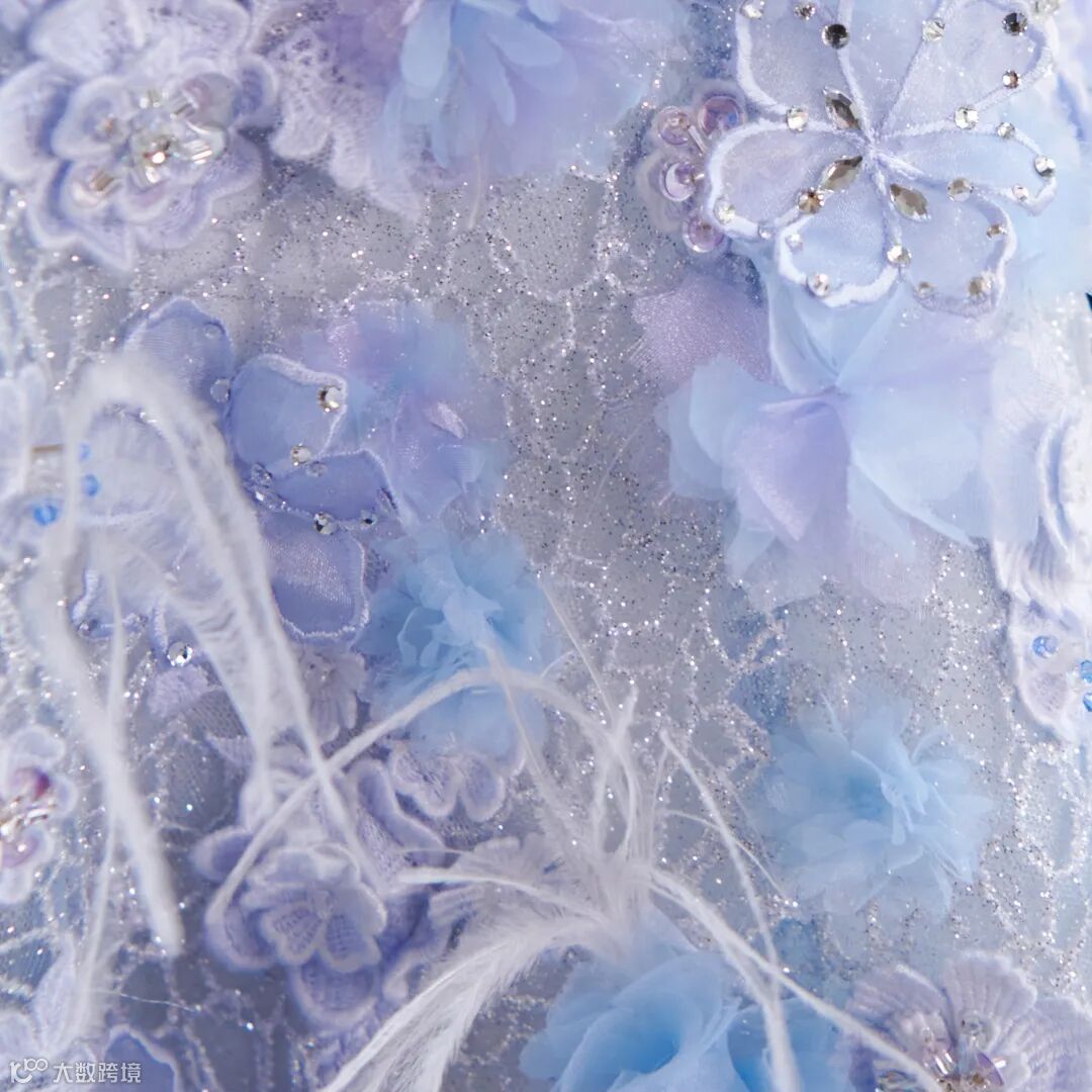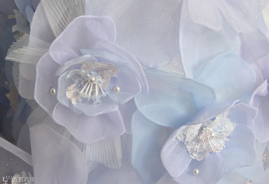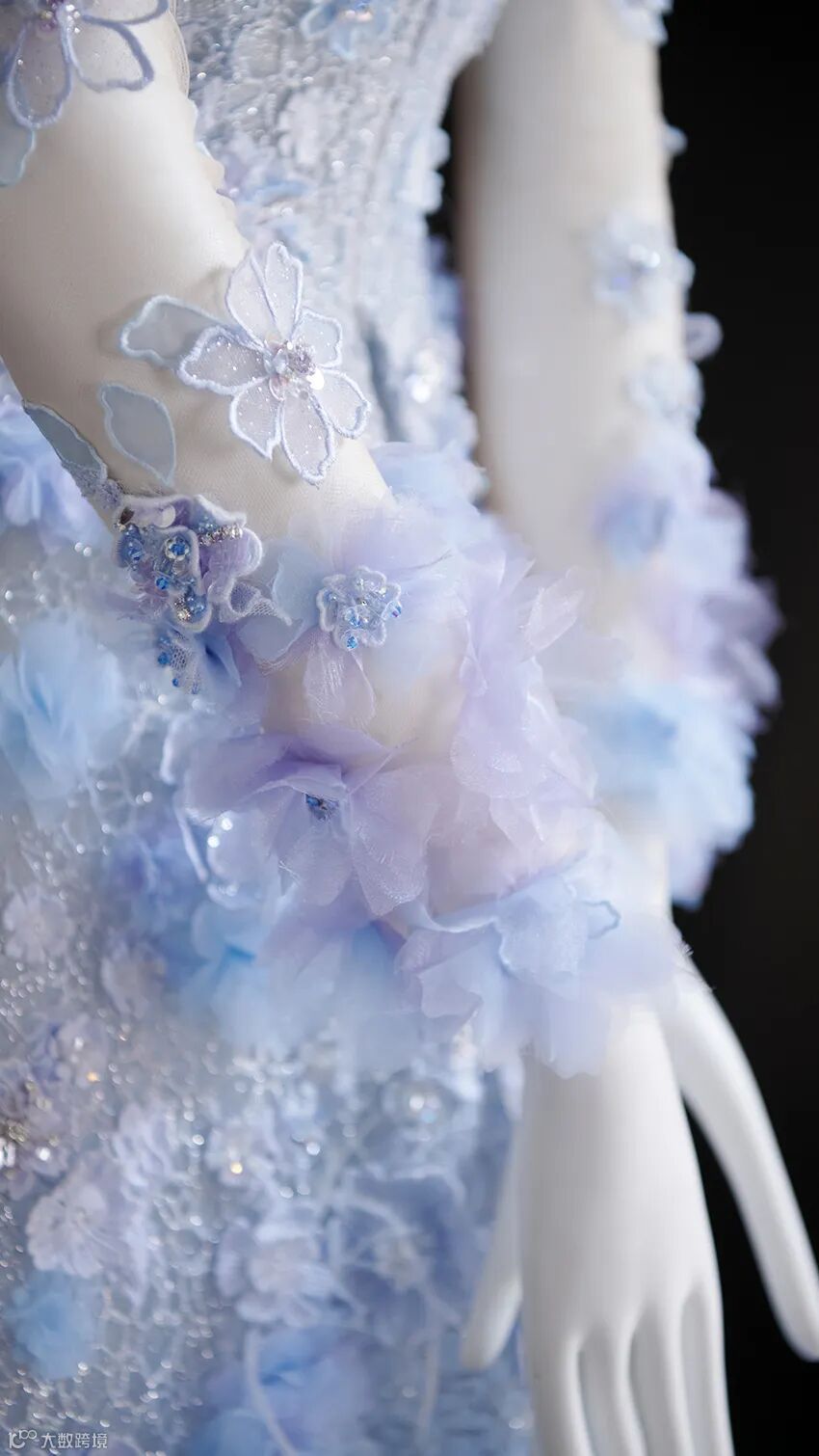 裙身则选用粉蓝花朵蕾丝覆底,并由朵朵薄纱和牙签褶折成的不同形状的当花心,通过缝钻、珠缝等装饰工艺,用一延伸数朵,构成一副油画般青紫色调。