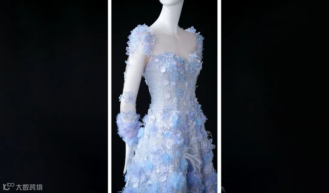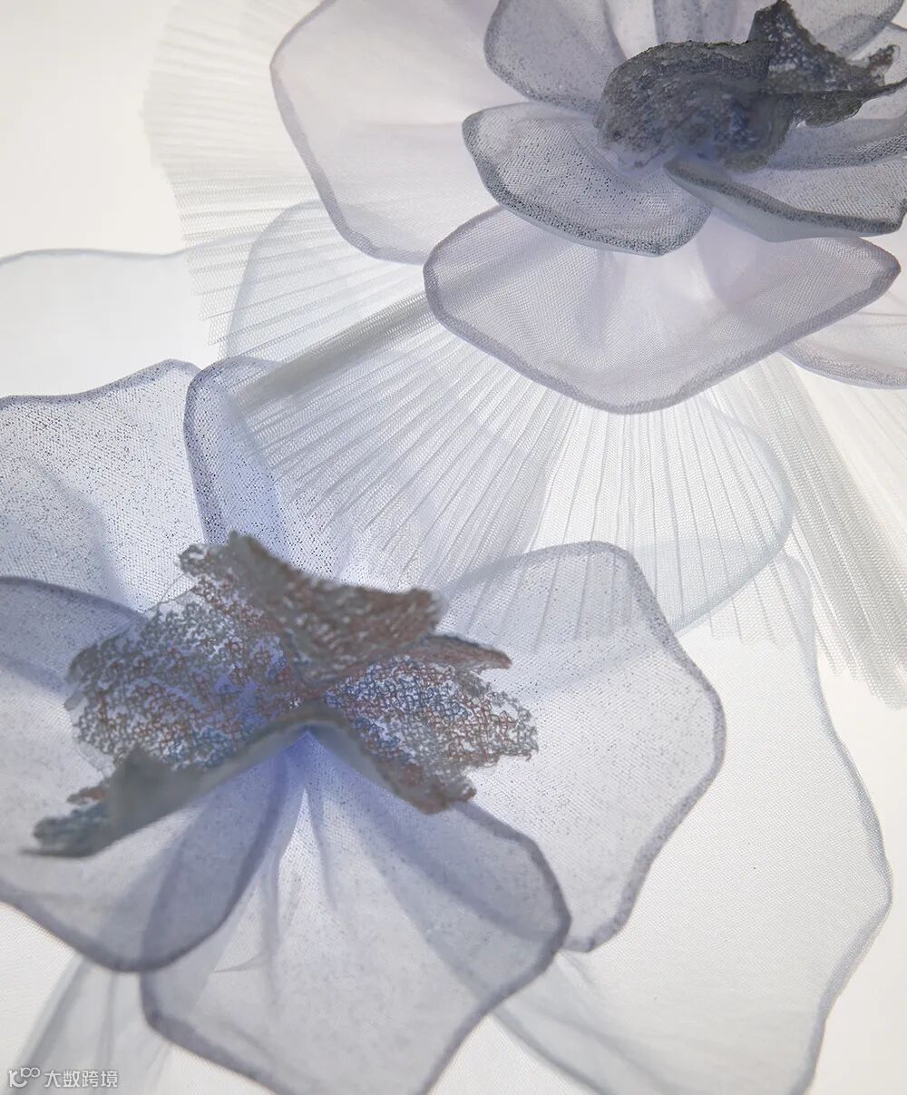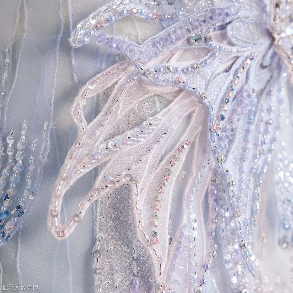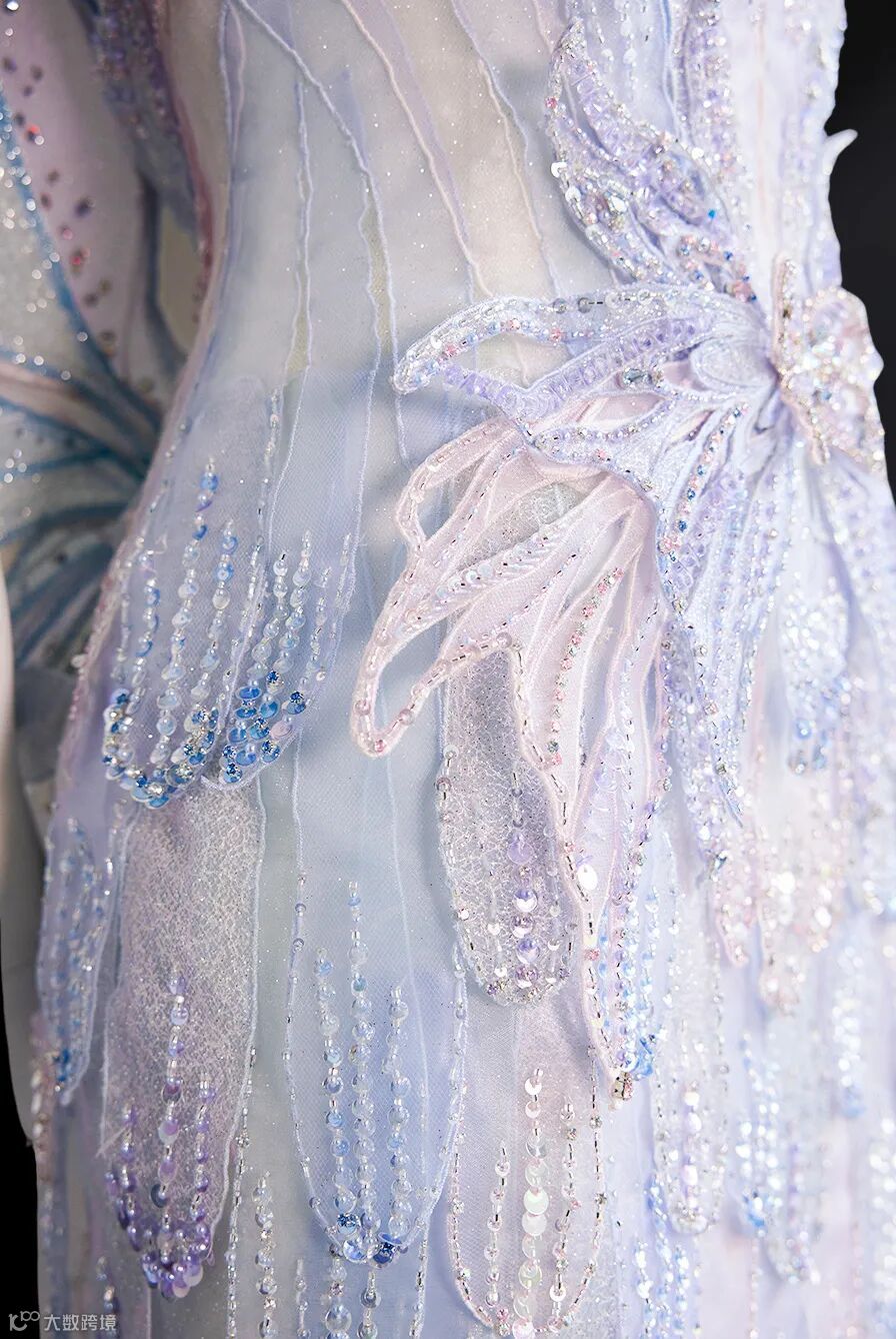 裙身则选用粉蓝花朵蕾丝覆底,并由朵朵薄纱和牙签褶折成的不同形状的当花心,通过缝钻、珠缝等装饰工艺,用一延伸数朵,构成一副油画般青紫色调。