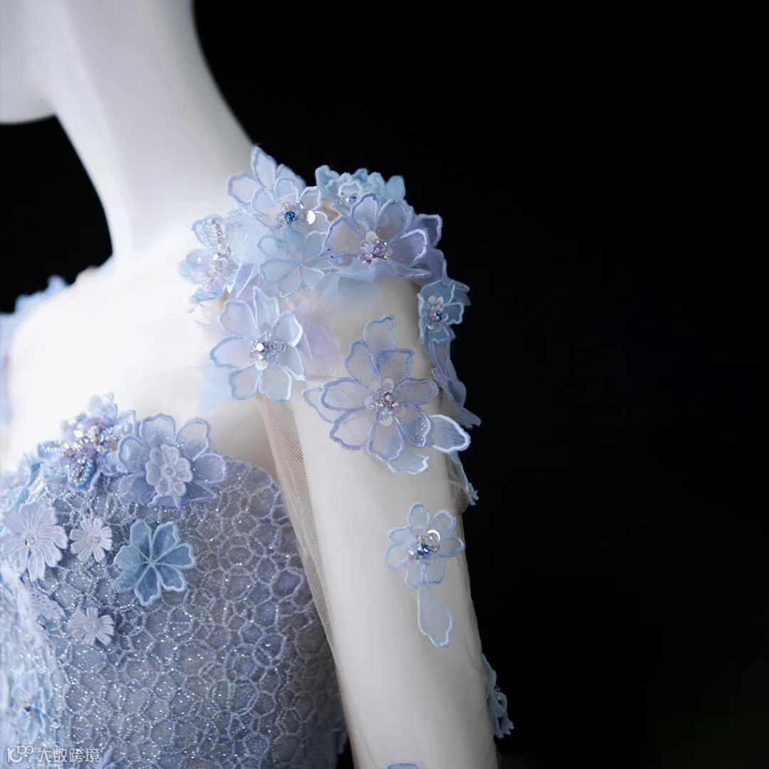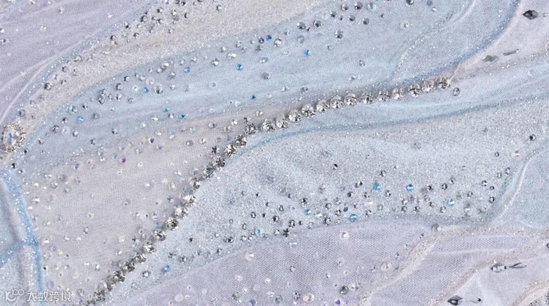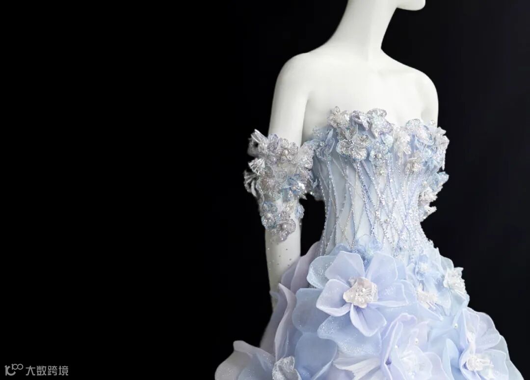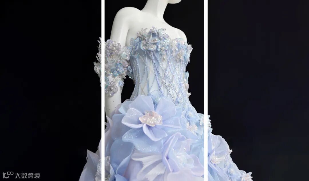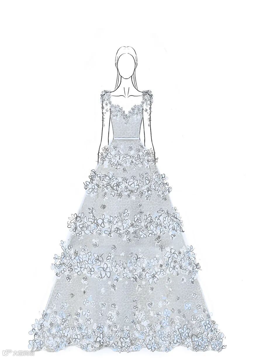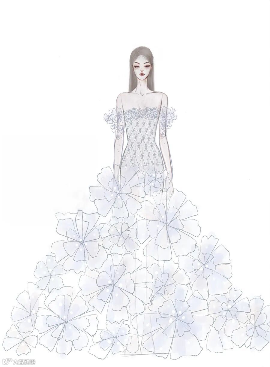 裙身则选用粉蓝花朵蕾丝覆底,并由朵朵薄纱和牙签褶折成的不同形状的当花心,通过缝钻、珠缝等装饰工艺,用一延伸数朵,构成一副油画般青紫色调。
