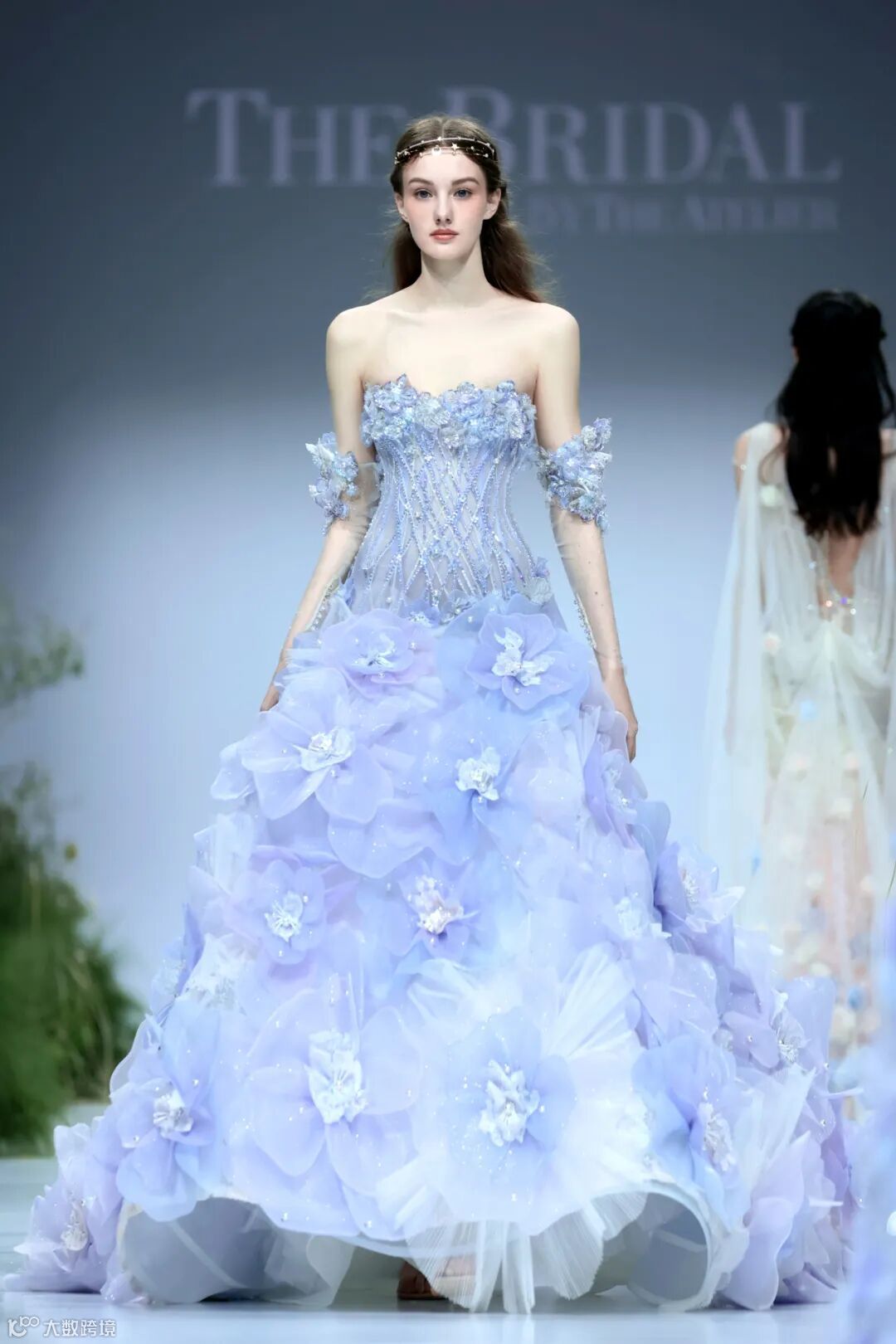 而Lea的灵感便来自于设计师的童心【爱丽丝奇境】,干净的一字肩抹胸搭配8种不同形状大小和颜色的花朵通过珠缝、串珠刺绣、烫钻缀成的手工立体花簇,打造出视觉上层次感,加入了可拆式袖套以及花簇的少女元素,一针一线倾注了设计师对【爱丽丝奇境】的美好期待。