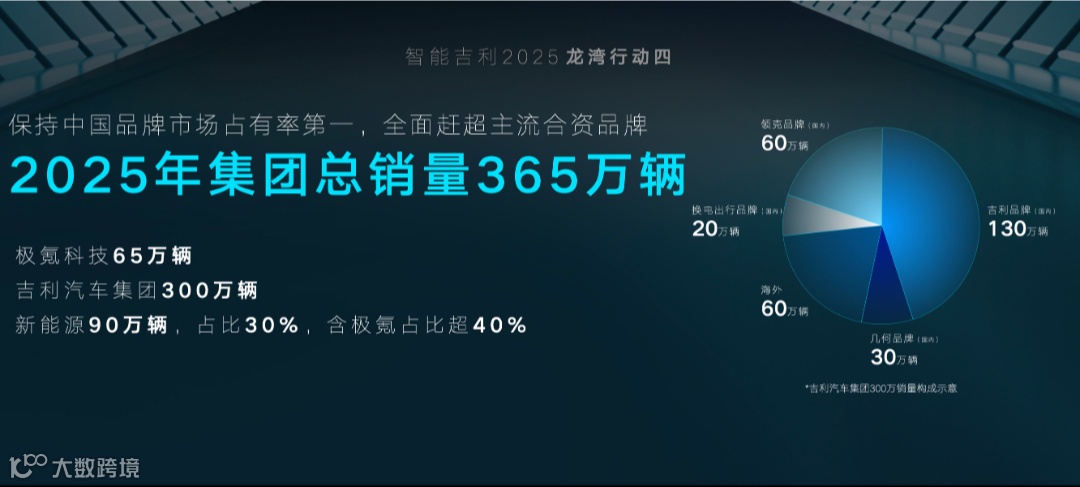国内市场,吉利品牌130万辆;几何品牌30万辆;领克品牌60万辆;全新的科技换电出行品牌20万辆,集团整体海外销量60万辆。