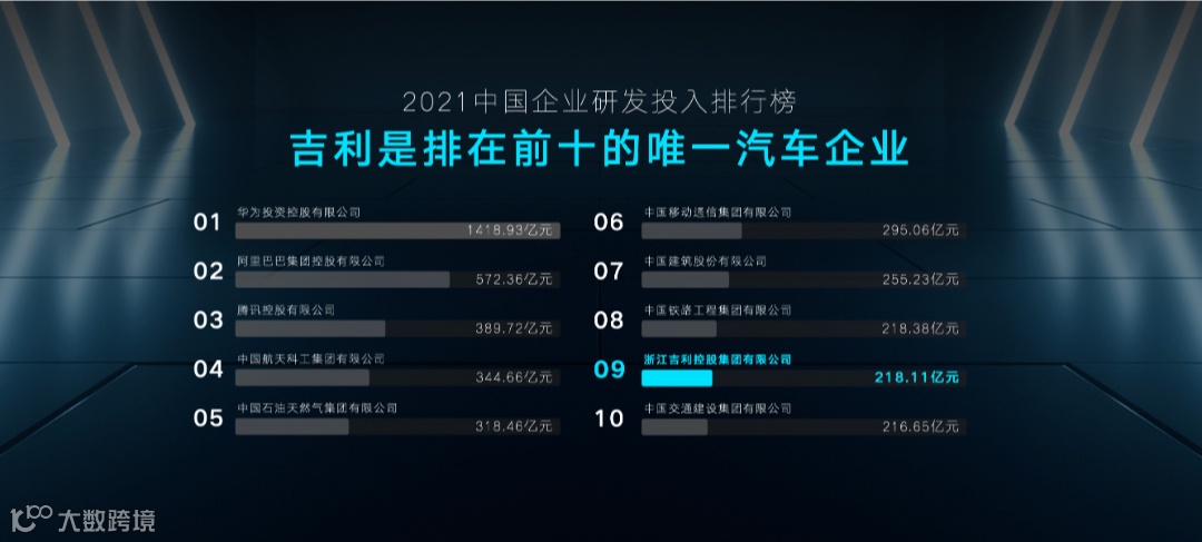 近期,“2021中国企业研发投入排行榜“发布,在这个排行榜上,吉利是排在前十的唯一汽车企业,排名第九,与一众科技巨头和国有大型企业并列。