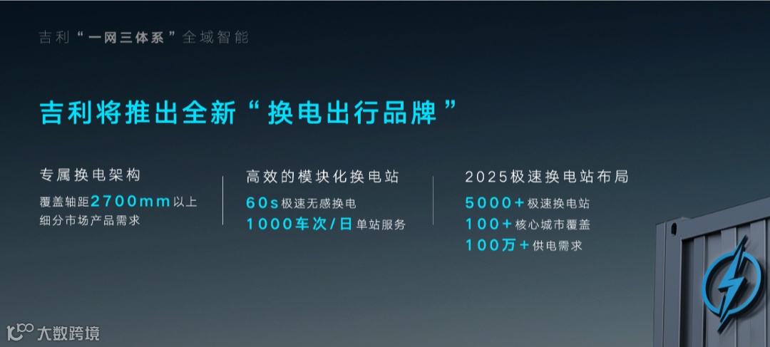 基于吉利专属换电架构,我们将推出全新“换电出行品牌”。高效的模块化换电站,实现每车仅需60秒的极速换电体验,每天单站可服务1000车次。