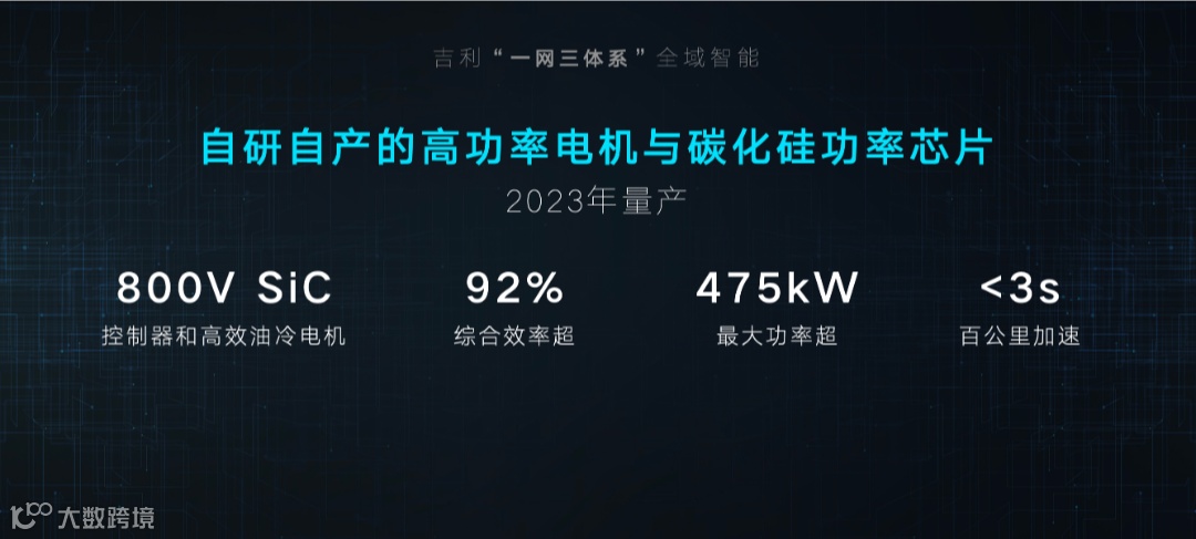 电驱方面,我们将应用800V,基于碳化硅功率器件的控制器和高效油冷电机,实现综合效率超92%,最大功率超475千瓦,最极致的产品可实现百公里加速低于3秒的超高性能体验。吉利自研自产的碳化硅功率芯片,也将于2023年量产。