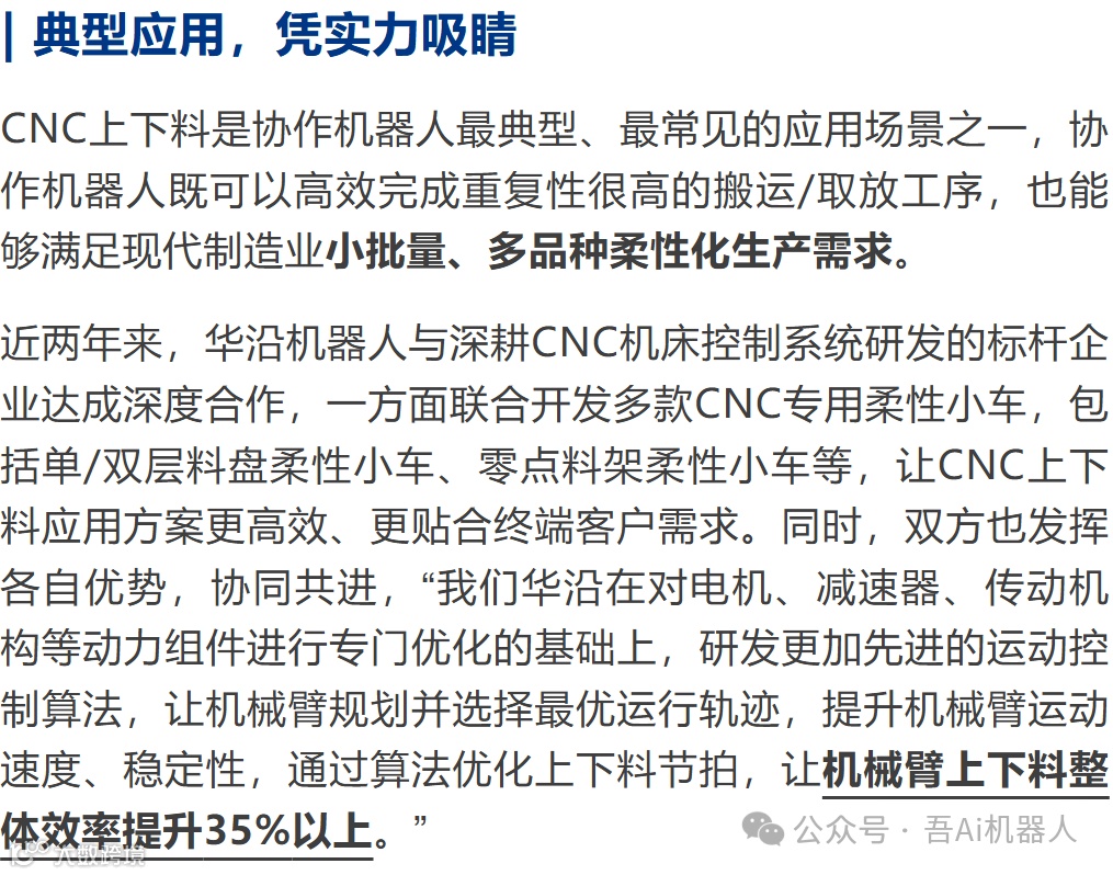 华沿机器人(原大族机器人)在高性能电机、伺服驱动、减速器等核心零部件领域实现自主研发,从源头控制质量与成本。其运动控制算法(如振动抑制算法、高精度轨迹控制算法)显著提升了应用效率,例如CNC上下料场景性能提升35%以上。此外,依托大族系20余年的技术积累,其在精密制造、运动控制等领域形成核心竞争力。