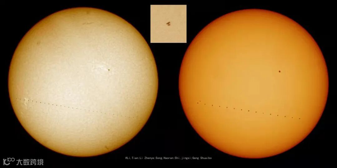 我们拍到了凌日过程的全貌,一共拍到的12帧空间站画面,经过后期叠加处理在了一起,还能看到太阳的上下各有一群黑子。局部图经过后期,强化了细节,能够看到展开的太阳能电池板和连接在一起的两个航天器,上方大的是“天和”核心舱,下方小的是天舟二号飞船。
