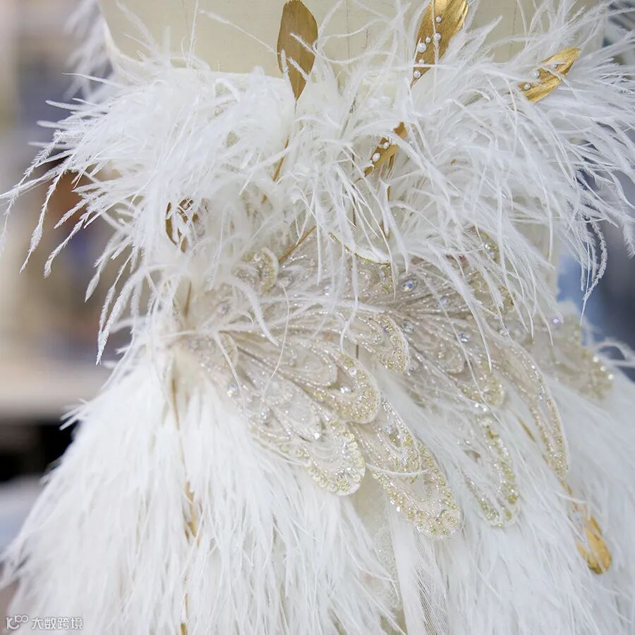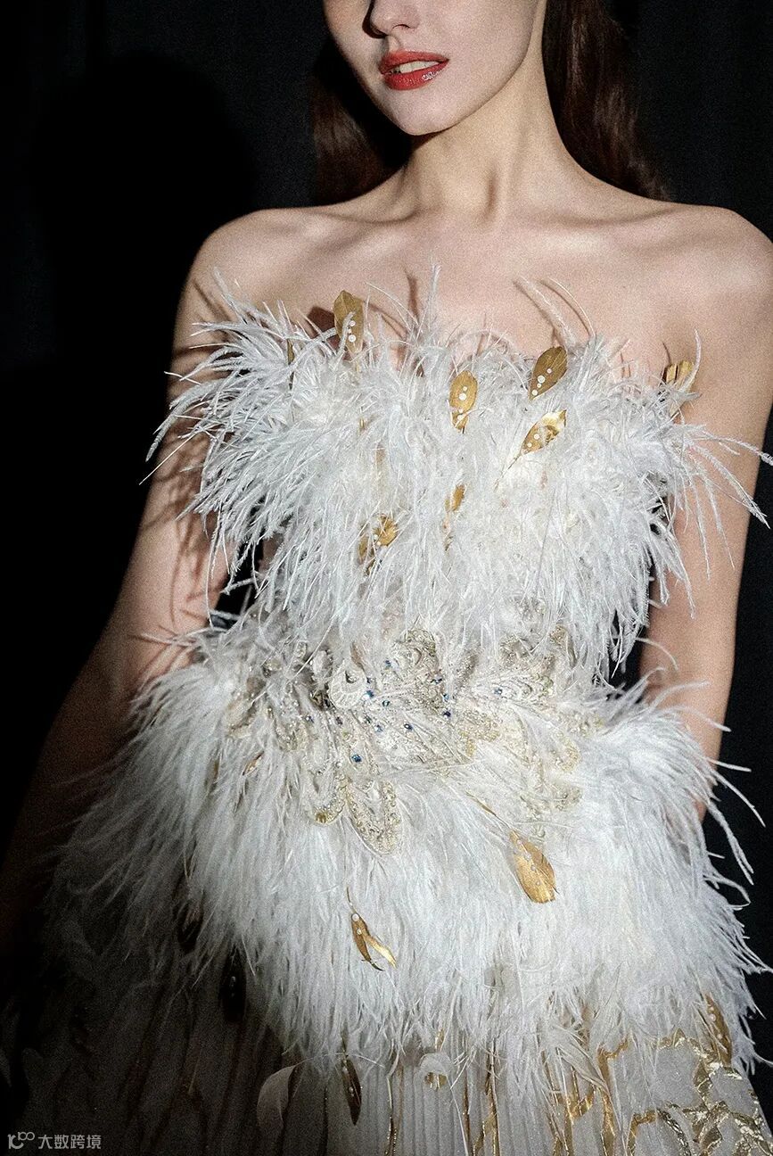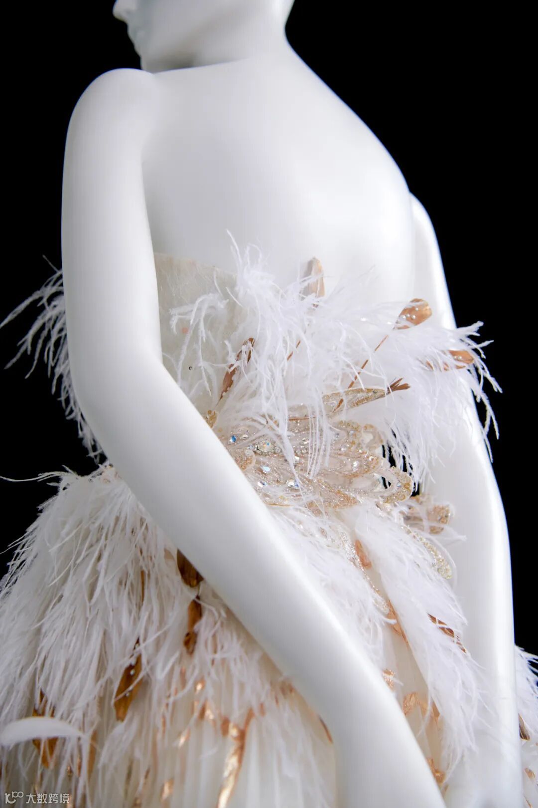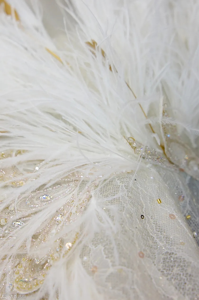 工匠师巧妙地融入了数根烧制的驼鸟毛,使得整体造型更加独特而耀眼。特别是腰间的设计更是匠心独运,采用粉色玫瑰金的手推绣羽毛结合精湛的珠缝和烫钻工艺,最后再通过镂空工艺增加层次,制成了一幅栩栩如生的羽翼图案,镶嵌在Rebecca的腰间,仿佛赋予了她在仙境中飞翔漫游的力量。