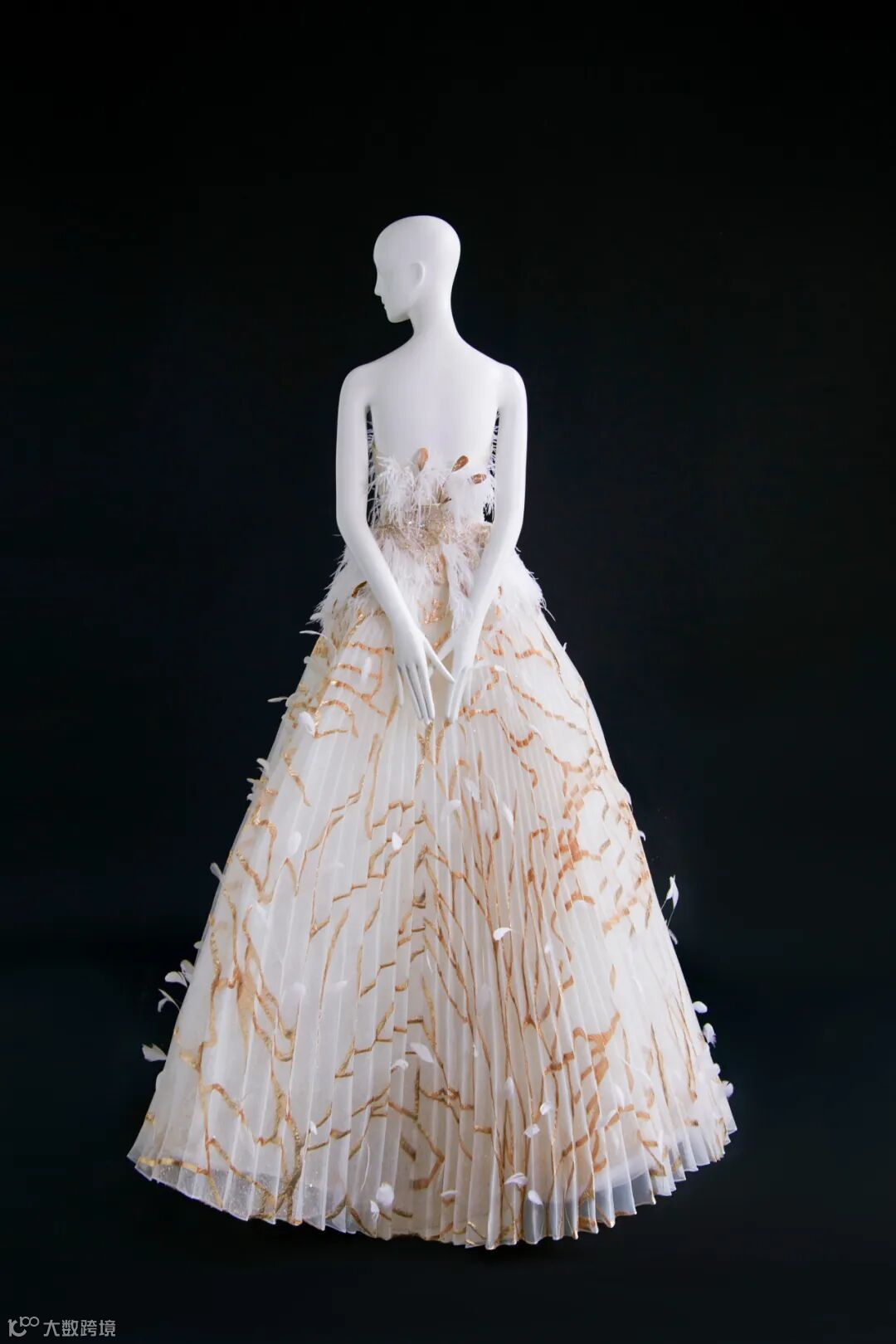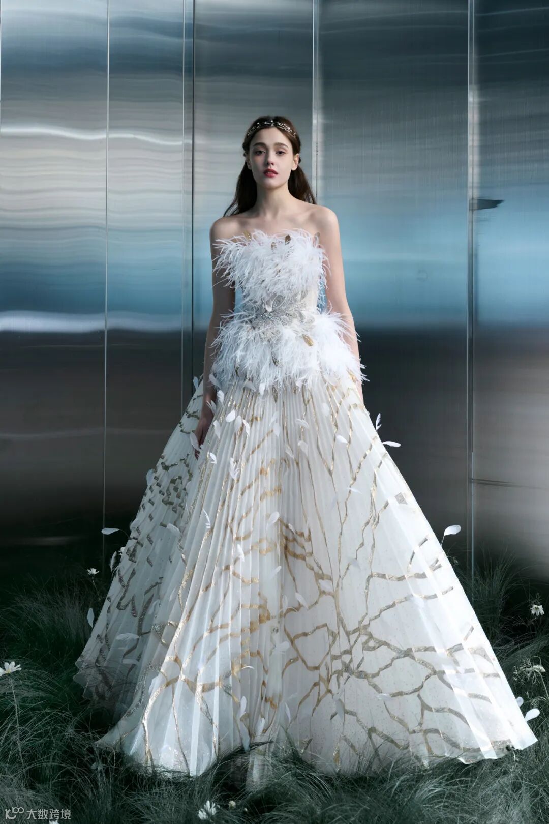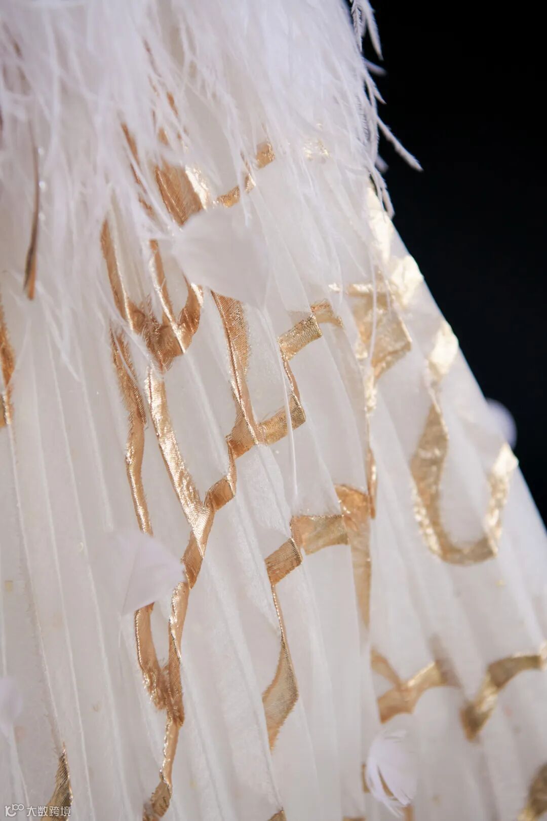 裙身通过牙签褶网纱形成放射状递次呈现构成褶裥裙身,层叠落羽之下的裙摆间闪灼着一条条金属面料的烫金,裙身处巧妙地点缀着数根山鸡毛,为整个裙装增添了一抹独特的韵味与华丽感。