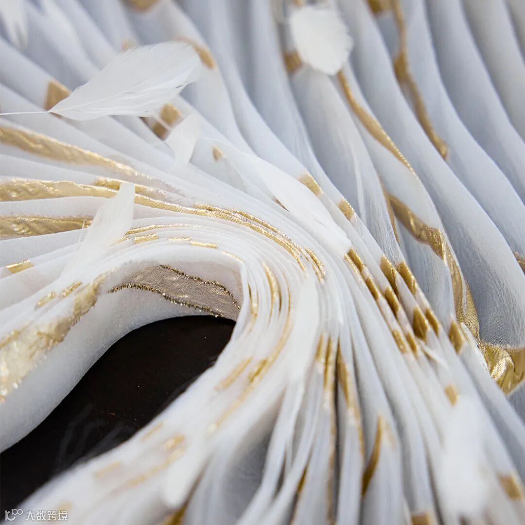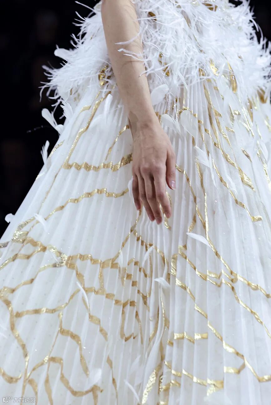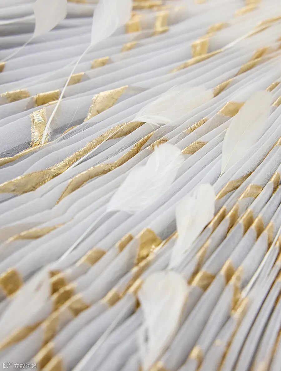 裙身通过牙签褶网纱形成放射状递次呈现构成褶裥裙身,层叠落羽之下的裙摆间闪灼着一条条金属面料的烫金,裙身处巧妙地点缀着数根山鸡毛,为整个裙装增添了一抹独特的韵味与华丽感。