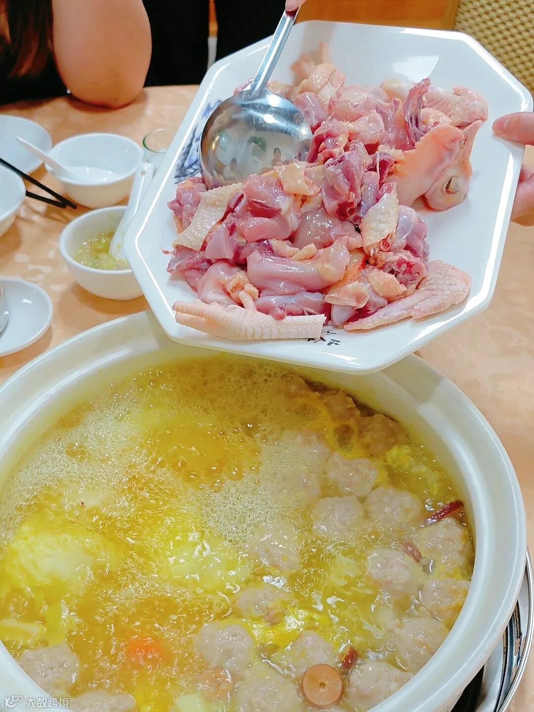 含榴莲锅底、清远凤中凰鸡一只、猪肉丸一份、鲜腐竹一份、时蔬一份、酱萝卜一份、茶水酱料米饭5位、纸巾1包