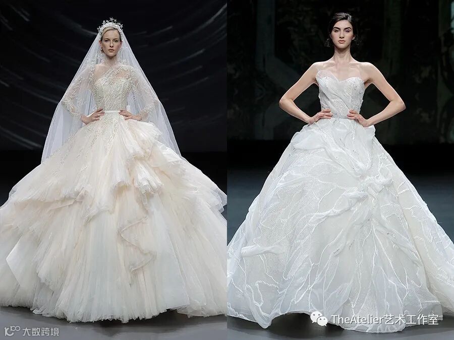 运用简洁的有机线条,通过曲线的粗细变化融合花卉植物的茎、虫鸟的翅膀等自然造型元素在蕾丝和刺绣图案上进行创作,在一定程度上实现“师法自然”,以此来寄望疫情后复苏的生机。同时沿袭品牌经典的宫廷大裙型设计与奢华的手工艺装饰,强调的更细腻的自然主义风格,将每一种美好象征通过现代的工艺方式寄寓在设计上,呈现出艺术与浪漫并存的梦幻婚纱。