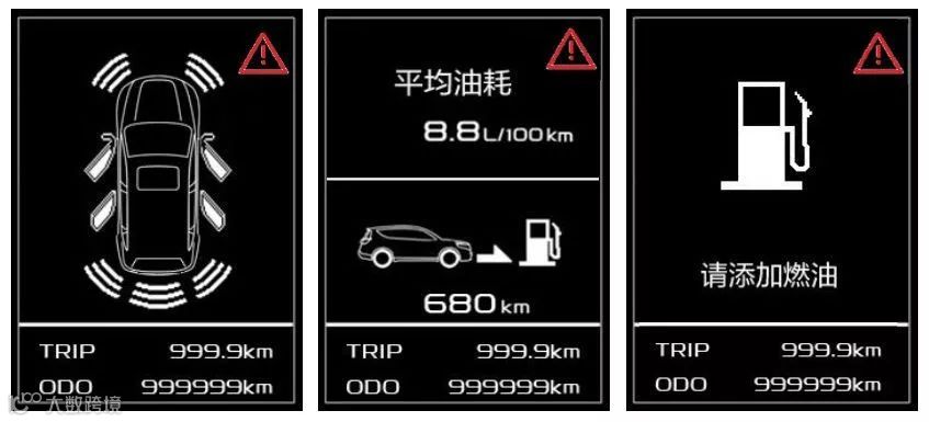 当你的车辆报警或提醒后,若出现以下3种情况,行车电脑右上角将会显示出“三角叹号符号”。