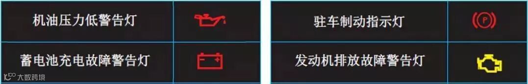 以下四个图标,驻车制动指示灯在释放制动后,会自行熄灭,另外3个警告灯在启动发动机后会熄灭。注意:如果行驶中以下图标持续点亮的话,请尽快联系就近服务站进行检修。