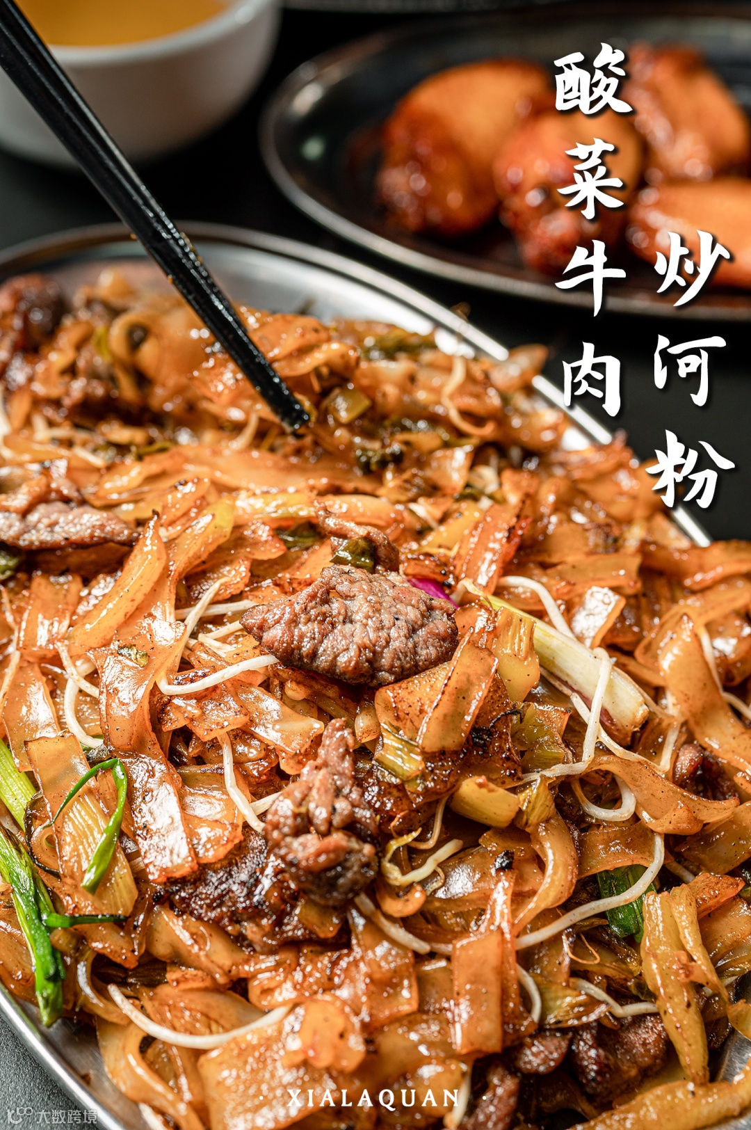 再来一份酸菜牛肉炒河粉做结尾吧,大锅热火爆炒后的河粉镬气十足,趁热夹起来吃满口香滑!