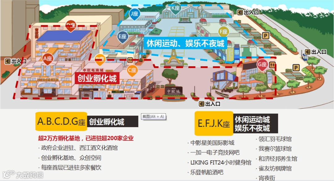 中欧电商城分为两大服务业态,分别为创业孵化基地与休闲、运动、娱乐不夜城。