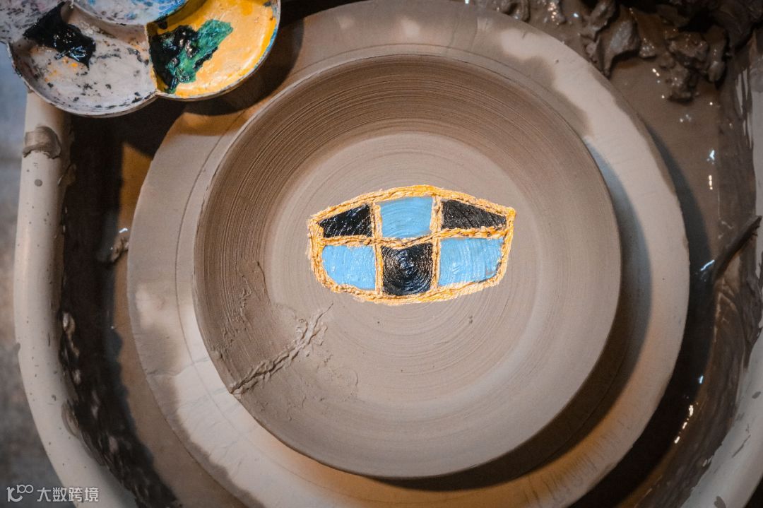 想着把这个陶器做成,送给车友当礼物。想了很久,决定在底部刻上吉利的LOGO。由于湿陶是没法上色的,所以先对着车钥匙勾勒出轮廓。但作画要等到烧好了才行,而精致的烧陶要等上好几天。于是我就就索性用吹风机将表面吹干,然后在上面作画了。