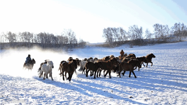 “走马行川雪海边,平沙莽莽黄入天”,这固然见不到黄沙,只能看见白雪皑皑,银装素裹。此时雪地里打着响鼻奔走觅食的马群,看那奔跑间溅起的飞雪,看那寒冷中呼出的雾气,看那冰雪中矫健的身影。脑中愣是响起了“让我们红尘作伴,活得潇潇洒洒”的景致,快哉快哉!