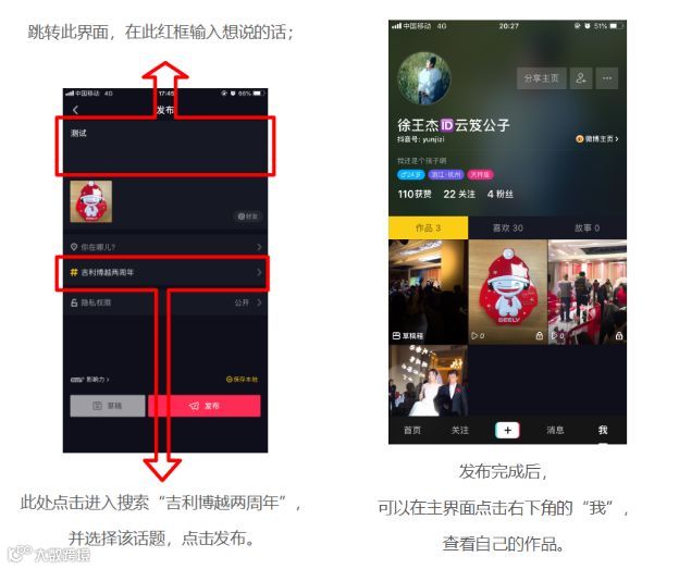 3、 在抖音发布创意短视频时,须添加#吉利博越两周年#活动主题;