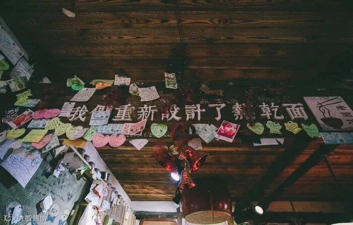 我们重新设计了热干面,店内其他的一些装饰也很有意思。这家店环境相当不错,还是个充满回忆的地方,墙上到处都是各种纪念和留言,我还看到了很多车票,甚至还有一张大学的请假条。