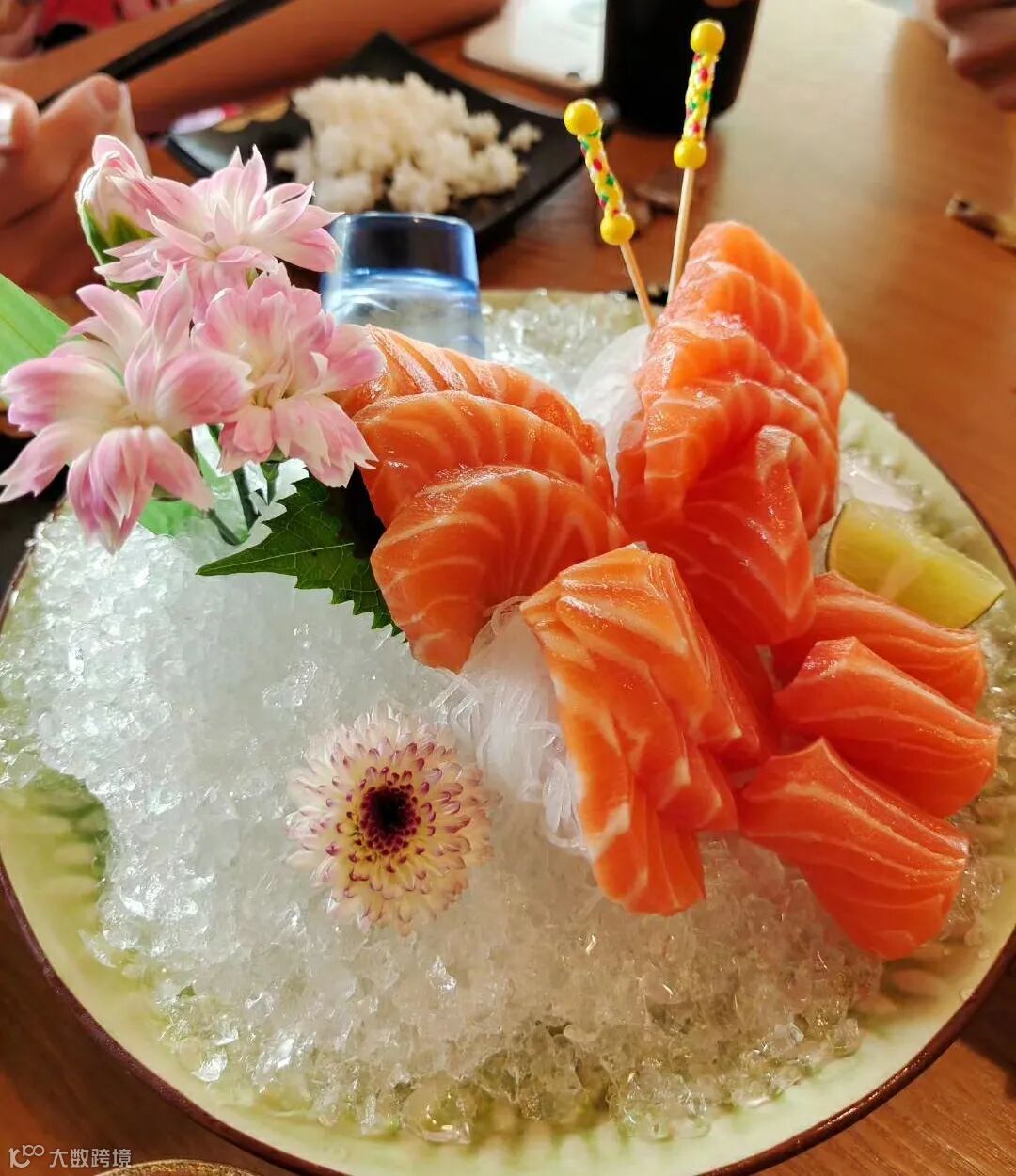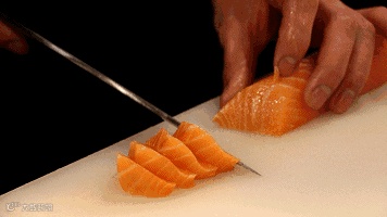 师傅手起刀落,三文鱼肉乖乖听话齐齐排队,加上花瓣摆盘碎冰,三文鱼刺身拼盘给胃来个夏日清凉!