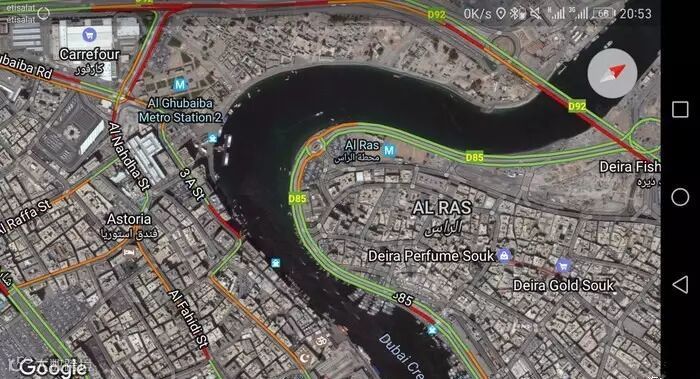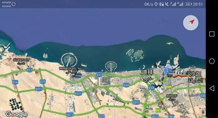 先发一张地图:鸟瞰迪拜。强烈感受一下,一边是海水一边是沙漠。注意截屏中蓝色的圆点,那个附近就是迪拜的老城。