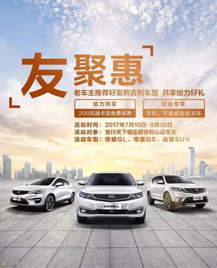 本次友聚惠时间: 2017年7月10日至9月30日(帝豪GL限4000名,帝豪GS限4000名,远景SUV限3000名,满额即止)。