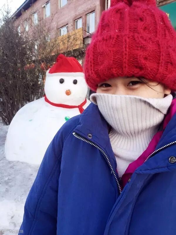 自幼生长在江南的小月姑娘,一下飞机就将自己全副武装成东北大妈。毫无时尚感与审美逻辑的红蓝配,无疑是对神州北极最基本的尊重。